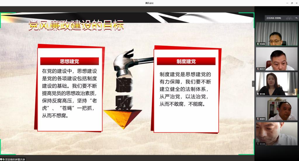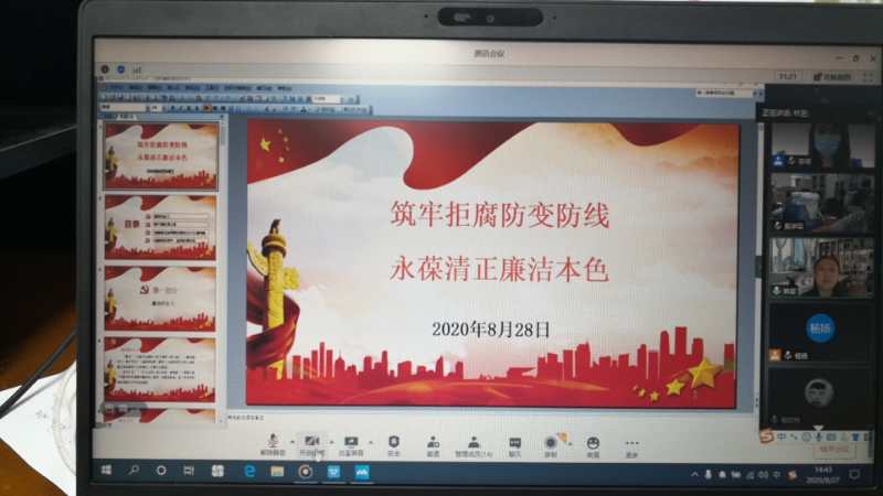 9月3日下午,学生住宿服务中心党支部通过腾讯会议,以PPT投屏的方式开展党风廉政建设“支部主题党日”活动。后勤保障处副处长贺亚锋和运输服务中心党支部的全体党员受邀参加。活动由中心党支部书记郭文娟主持。在完成奏唱国歌、重温入党誓词的规定动作后,贺亚锋为参会人员讲授题为《党风廉政建设》的专题党课。