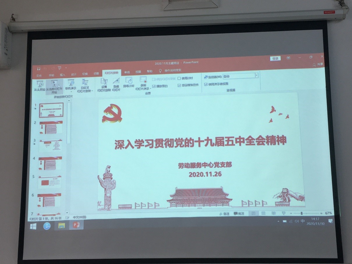 11月27日上午,劳动服务中心党支部在中心会议室开展“支部主题党日”学习活动,支部全体在岗党员参加此次活动。会议由中心党支部书记黄晶晶主持。 在完成奏唱国歌、重温入党誓词规定动作后,与会人员通过观看视频及图解的方式,深入学习领会十九届五中全会精神,重点学习习近平总书记重要讲话精神和《中国共产党