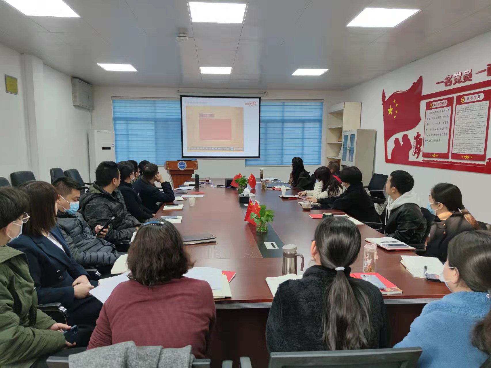 11月25日下午,物业服务中心党支部在中心三楼会议室开展11月份“支部主题党日”活动,支部正式党员、预备党员共14人参加此次活动,会议由组织委员兼纪检委员王冬青同志主持。在完成奏唱国歌、重温入党誓词等规定动作后,参会党员共同学习了党的十九届六中全会精神。党的十九届六中全会是在“两个一百年”奋斗目标