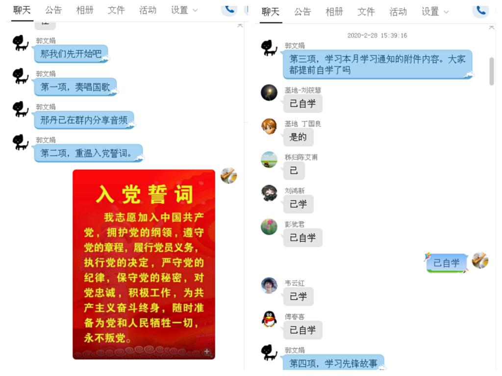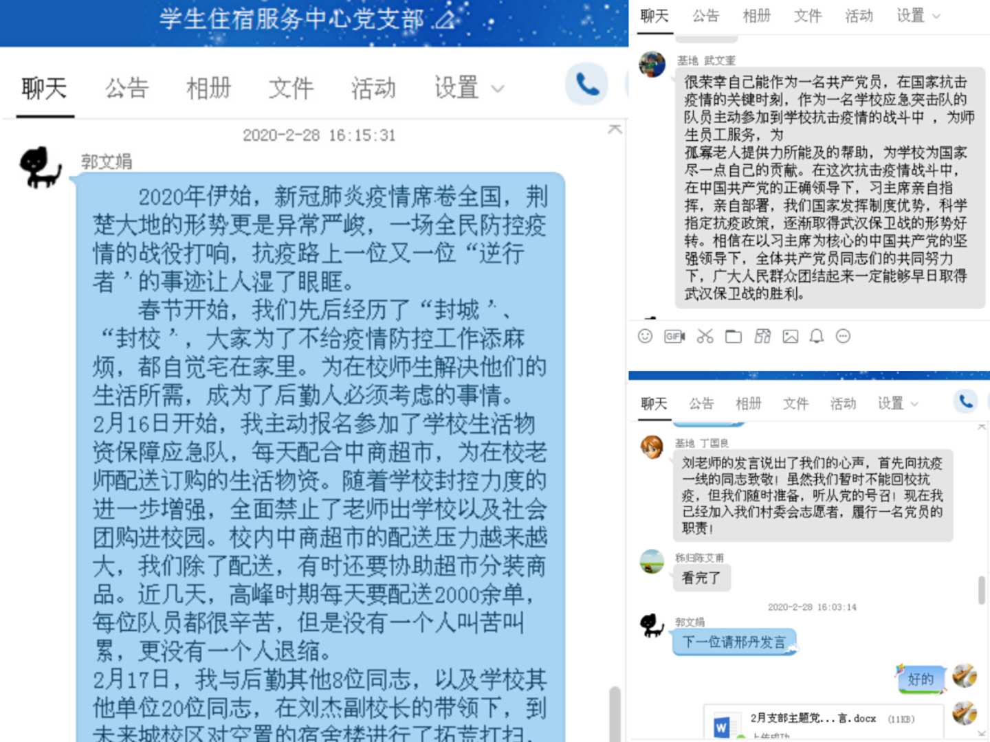 2020年的春天,一场突如其来的新冠肺炎疫情肆虐神州大地。一个多月来,全校上下众志成城,抗击疫情,后勤保障处的同志更是贡献着自己的力量。2月28日下午,学生住宿服务中心党支部通过支部QQ群开展了一次特殊的“支部主题党日”活动,支部党员和入党积极分子共14人参加。此次活动由中心党支部书记郭文娟主持。