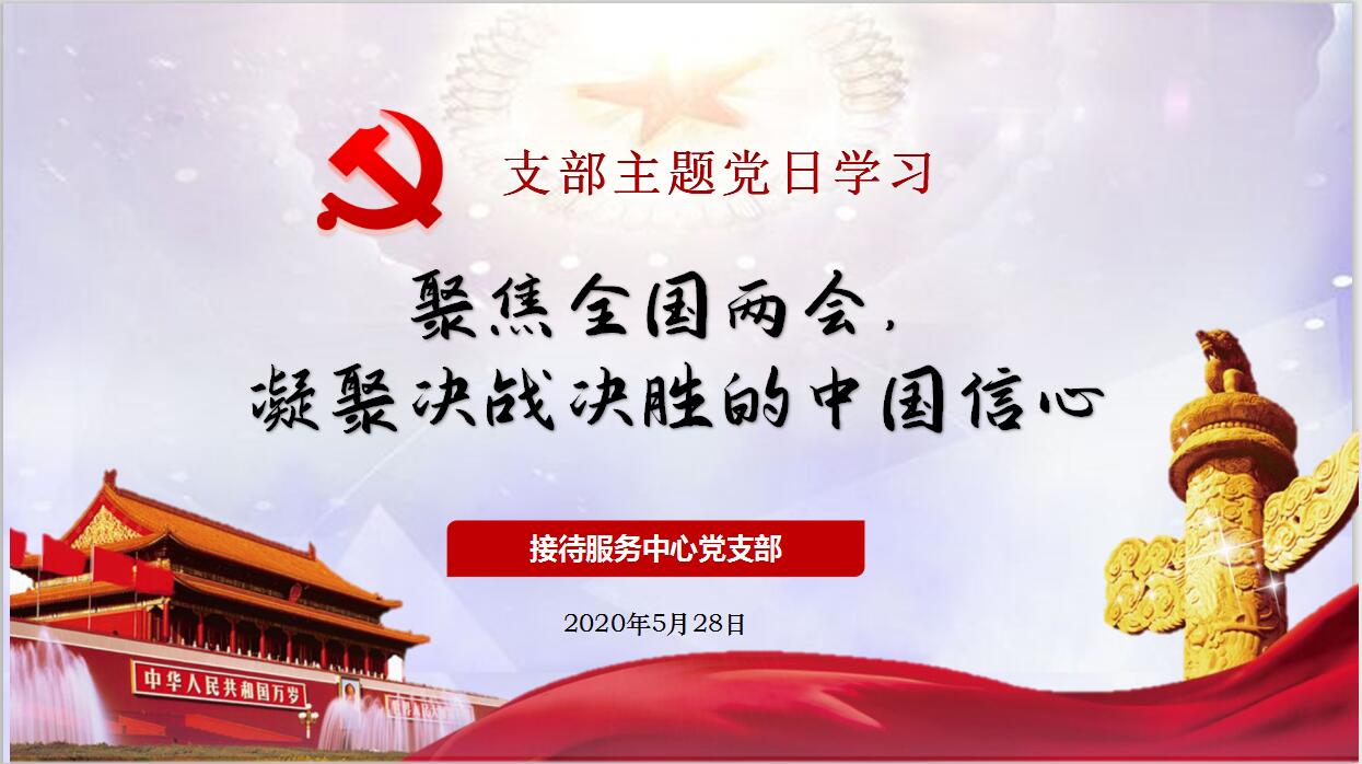 5月28日下午2:30,接待服务中心党支部按照学校组织部和后勤党委要求,结合学校工作实际,在中心党员活动室开展5月份支部主题党日活动,本月的主题是:“聚焦全国两会,凝聚决战决胜的中国信心”,活动由支部书记殷学军主持,13名正式党员和2名入党积极分子参加了会议,1名党员通过线上方式参加了学习。