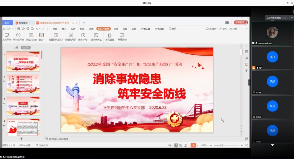 6月28日下午,学生住宿服务中心党支部通过腾讯会议,以PPT投屏的方式开展6月份“支部主题党日”活动,支部党员和入党积极分子共15人参加。活动由中心党支部书记郭文娟主持。