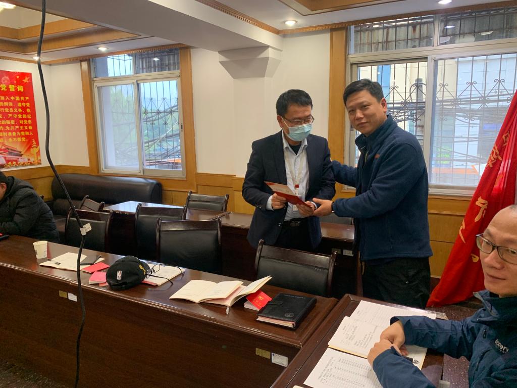 会议第三项,支部书记徐力为本月过政治生日的党员陈刚同志献上政治生日贺卡。