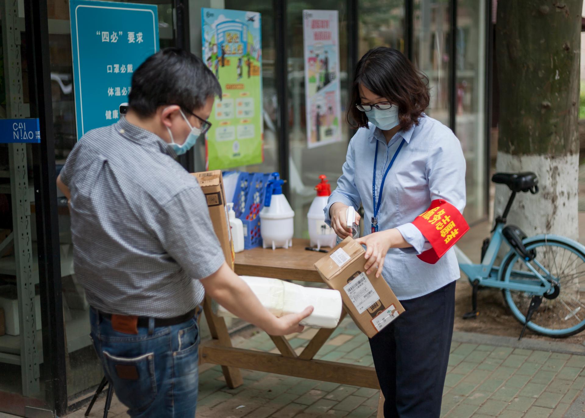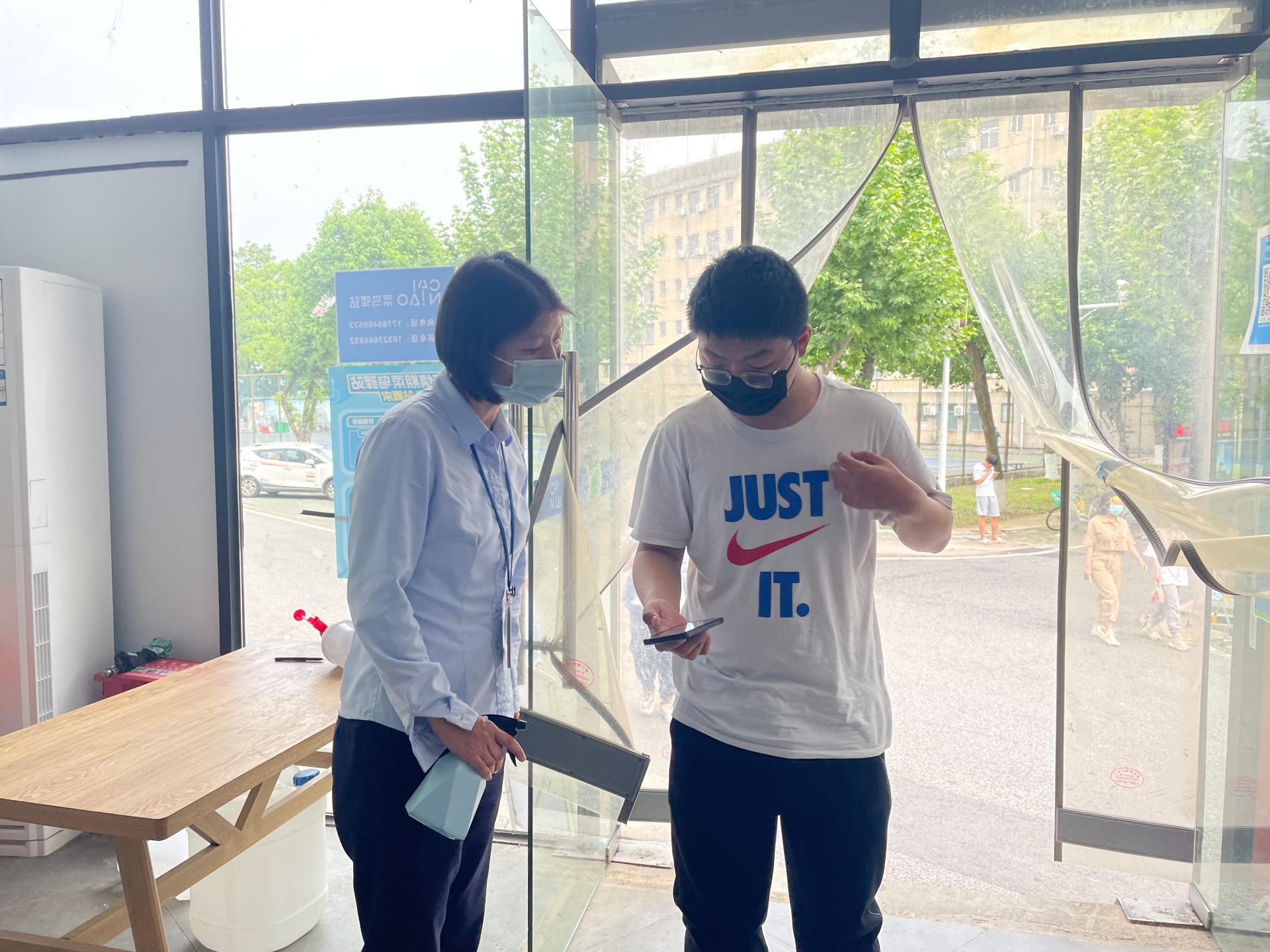 胡梦晴正在进行楼宇封控 地大社区工作人员摄