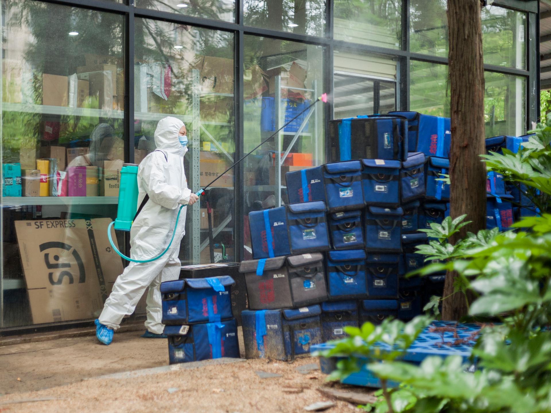 王冬青在菜鸟驿站负责快件消杀 江楚摄