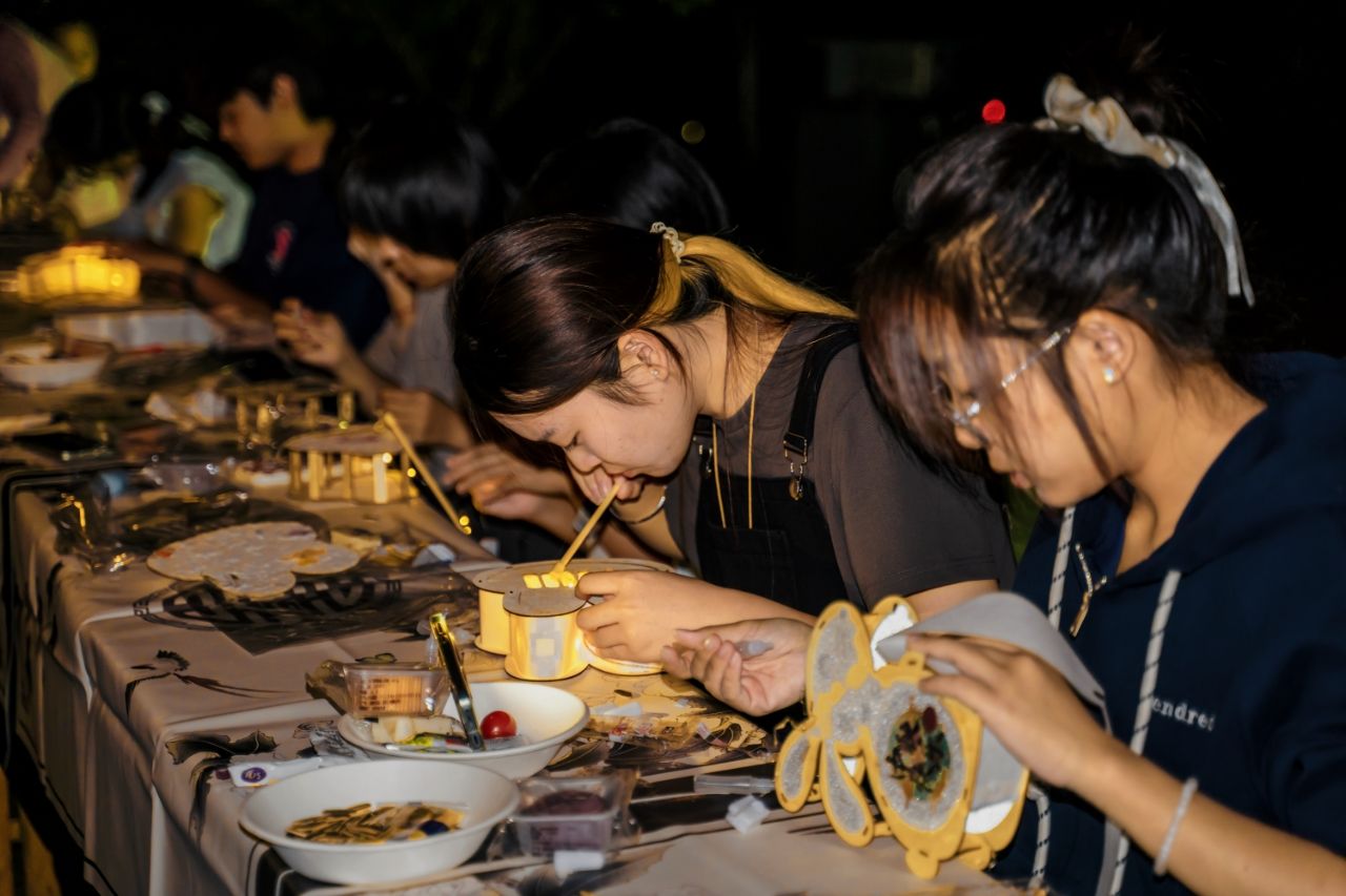 “穿吊绳、挂吊穗、缠灯线、粘花饰……”分组合作,充分发挥创意制作花灯。不一会儿,样式各异的手工花灯便呈现在大家面前。花环中央“绽放”的莲花清新淡雅,憨态可掬的“玉兔”为花灯增添了灵动。轻触开关,流光溢彩的花灯照亮了整个活动现场。月饼品尝区准备了多种口味的月饼,从传统的五仁、豆沙到创新的冰皮月饼,满足了不同学生的口味需求。