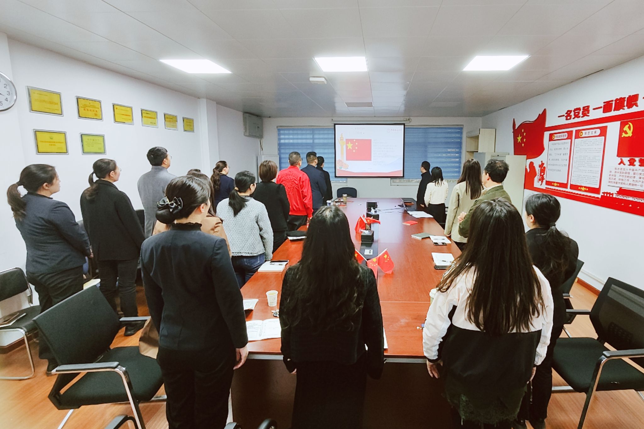 按照支部主题党日规定动作要求,全体党员齐唱国歌,由10月过政治生日的罗桂顺同志带领大家重温入党誓词,吴华玉同志带领大家学习《中国共产党章程》总纲部分中“十一届三中全会……引导我国社会主义现代化事业不断前进”此段内容。