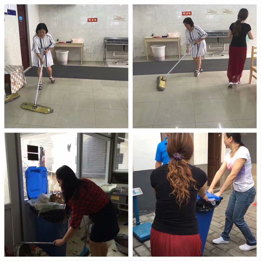我们一到基地,首先感受到的是,酷暑高温下,基地后勤工作人员丝毫不减工作热情,积极为实习基地的师生做好各项服务准备工作。公司党支部党员受到这样工作热情地感染,按耐不住激动之情,积极参与到基地工作人员的队伍中去。党员同志每天凌晨5点起床,分为两组,一组由姚红莲带领与食堂师傅一起择菜、洗菜、切菜、清扫垃圾、准备早餐;二组由黄晶晶带领与物业师傅一起清扫教室卫生、打扫院子、清理垃圾等。一周的实践活动让我们深切地感受到基地工作人员不畏高温、兢兢业业的工作热情,他们用艰苦朴素的工作作风为在周口店实习的全体师生提供一个整洁、舒适的生活环境。