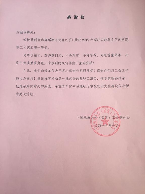 今收到一封来自校工会的感谢信,信中提到我单位柏松、彭海燕两位员工参加学校原创音乐舞蹈剧《大地之子》荣获2019年湖北省科教文卫体系统职工文艺汇演一等奖。信中感谢这两位员工不畏艰苦、不辞辛劳,克服重重困难,在剧中扮演重要角色,为该剧的成功作出了重要贡献,同时也感谢后勤保障处的大力支持。