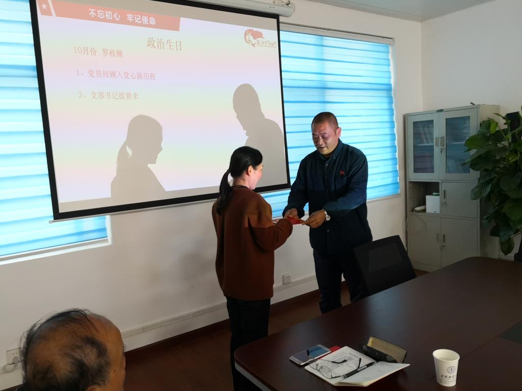 主题党日活动上,本月过政治生日的党员罗桂顺向大家分享了自己的入党经历和感受,她对照入党志愿,查找了自身差距,表明了下一步工作的方向和决心。“罗桂顺同志,今天是你的‘政治生日’,2008年10月,你光荣加入了中国共产党,开启了你的政治生命,在你党龄11周年之际,党组织向你表示衷心的祝贺。希望你牢记入党誓词,践行党的宗旨,履行党员职责,永葆党员的纯洁性和先进性,尽职尽责……”党支部书记殷学军将“党员政治生日卡”交到罗桂顺手中时,这样说到。