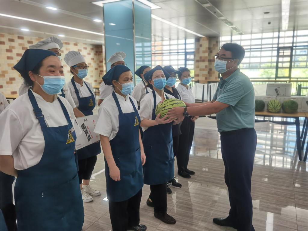 8月18日,后勤保障处处长王文起、副处长刘清华赴未来城校区学一食堂慰问暑期在岗一线职工。王文起一行到食堂操作间和各个服务档口看望值班人员,表达对他们顶着高温酷暑,坚守灶台服务师生的衷心感谢和诚挚慰问,送去学校和后勤对他们的关爱和肯定。
