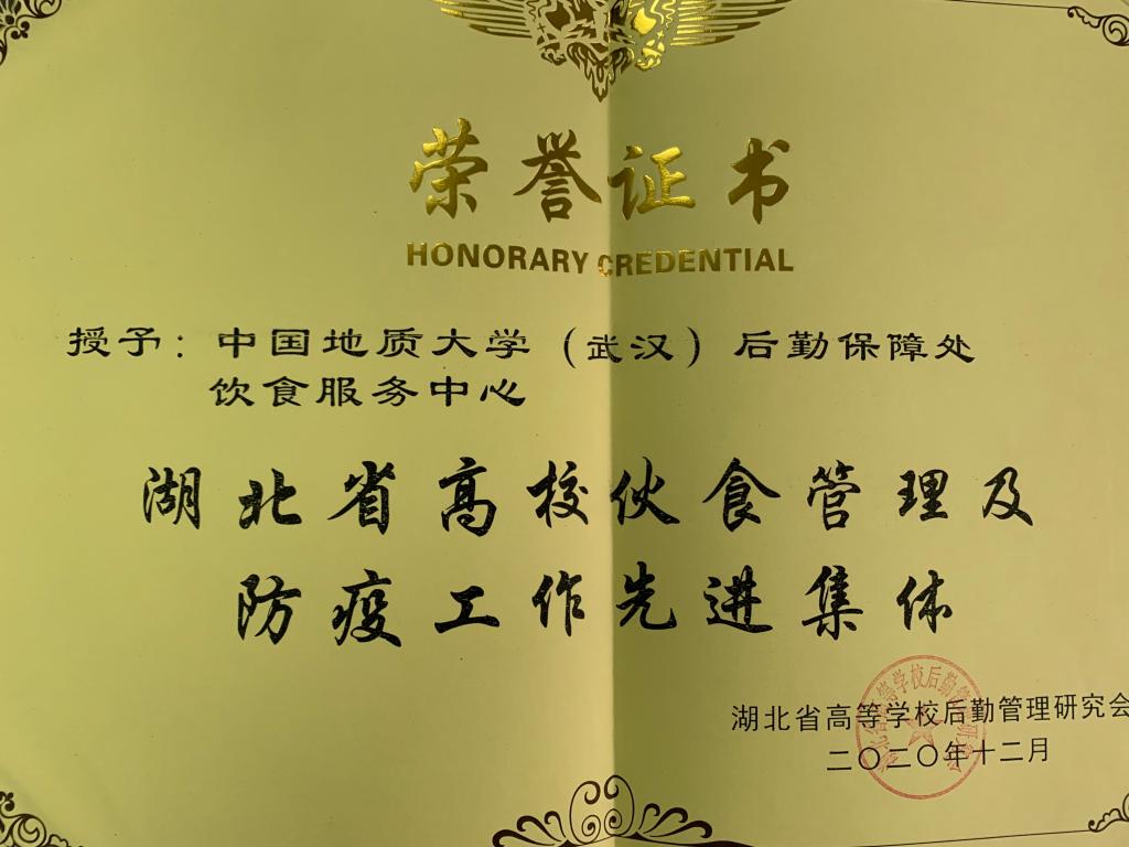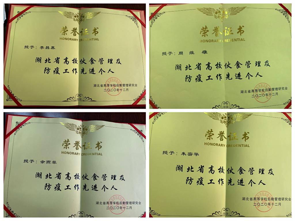 2020年12月16日,湖北省高等学校后勤管理研究会伙食管理专业部年会在襄阳召开,大会表彰了2020年度湖北省高校伙食管理及防疫工作先进集体及先进个人。饮食服务中心被评为“2020年度湖北省高校伙食管理及防疫工作先进集体”,朱密华、李昌奡、周维雄、余燕菲四人被授予“湖北省高校伙食管理及防疫工作先进个人”荣誉称号。