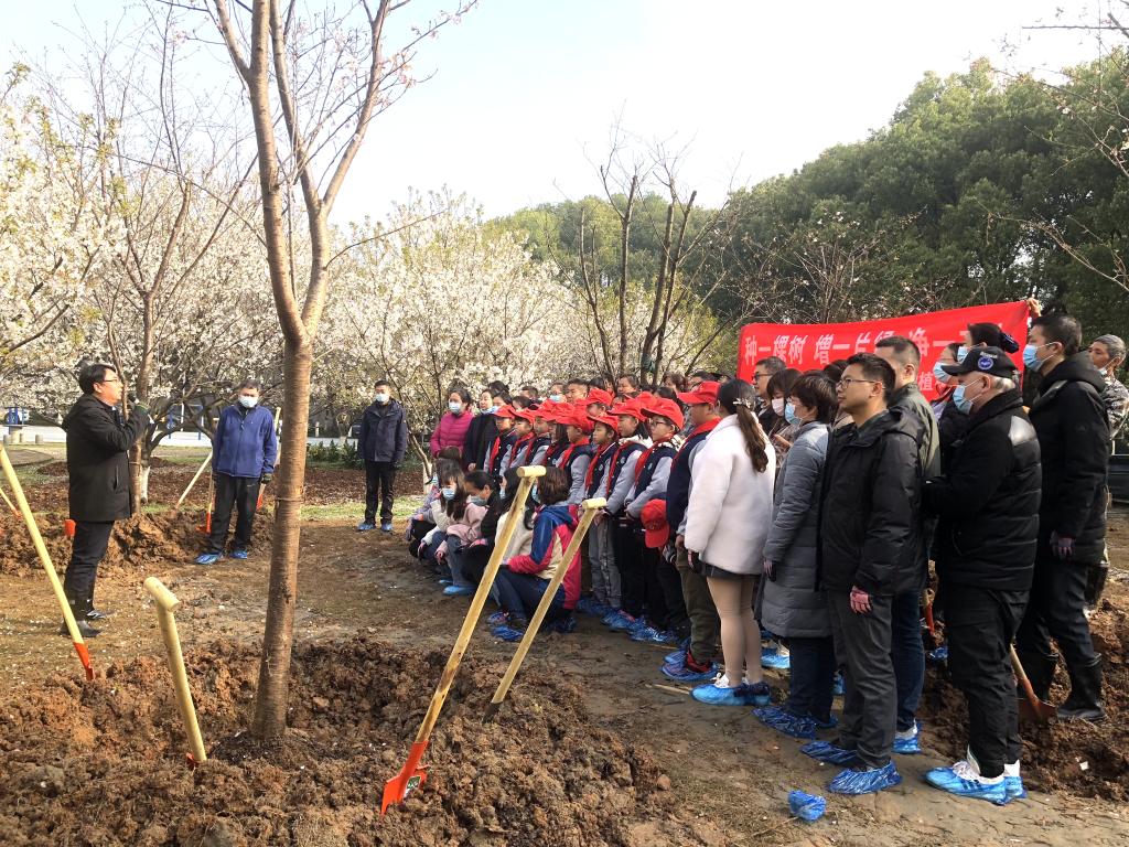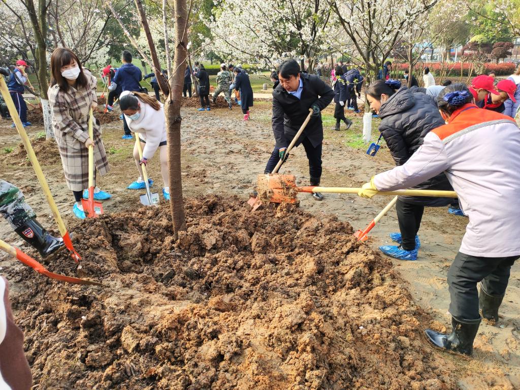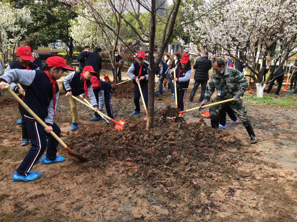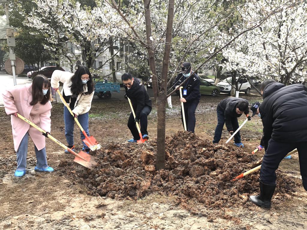 活动中,大家踩着泥泞,在物业服务中心校园服务部专业技术人员的指导下,挥锹铲土、填入树苗、培实新土、浇水施肥……一同栽下12棵吉野樱,原本空旷的场地呈现出勃勃生机。