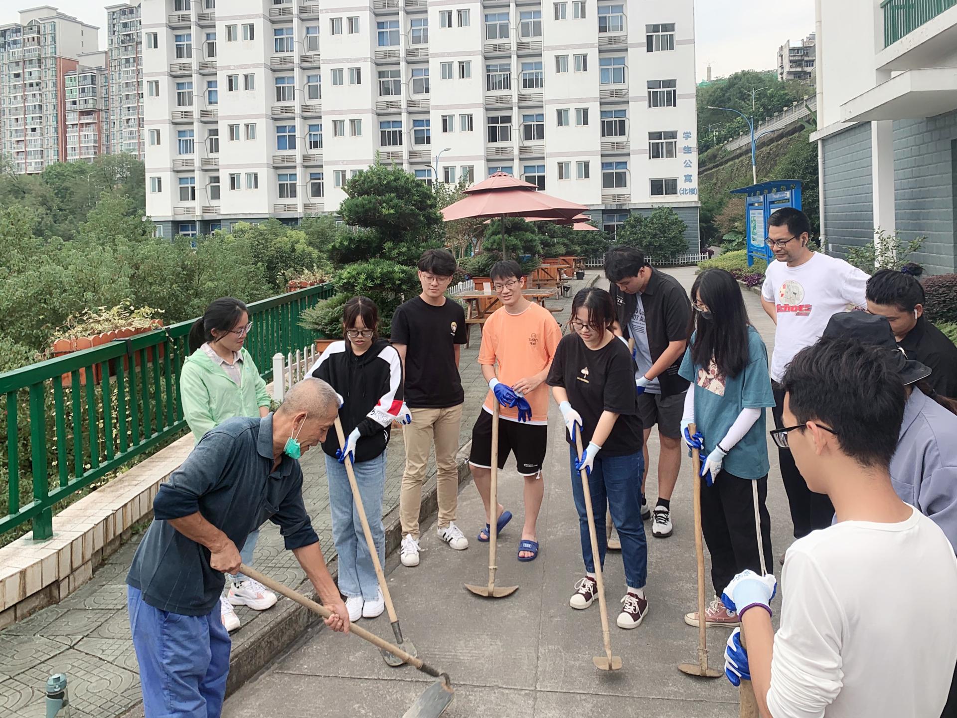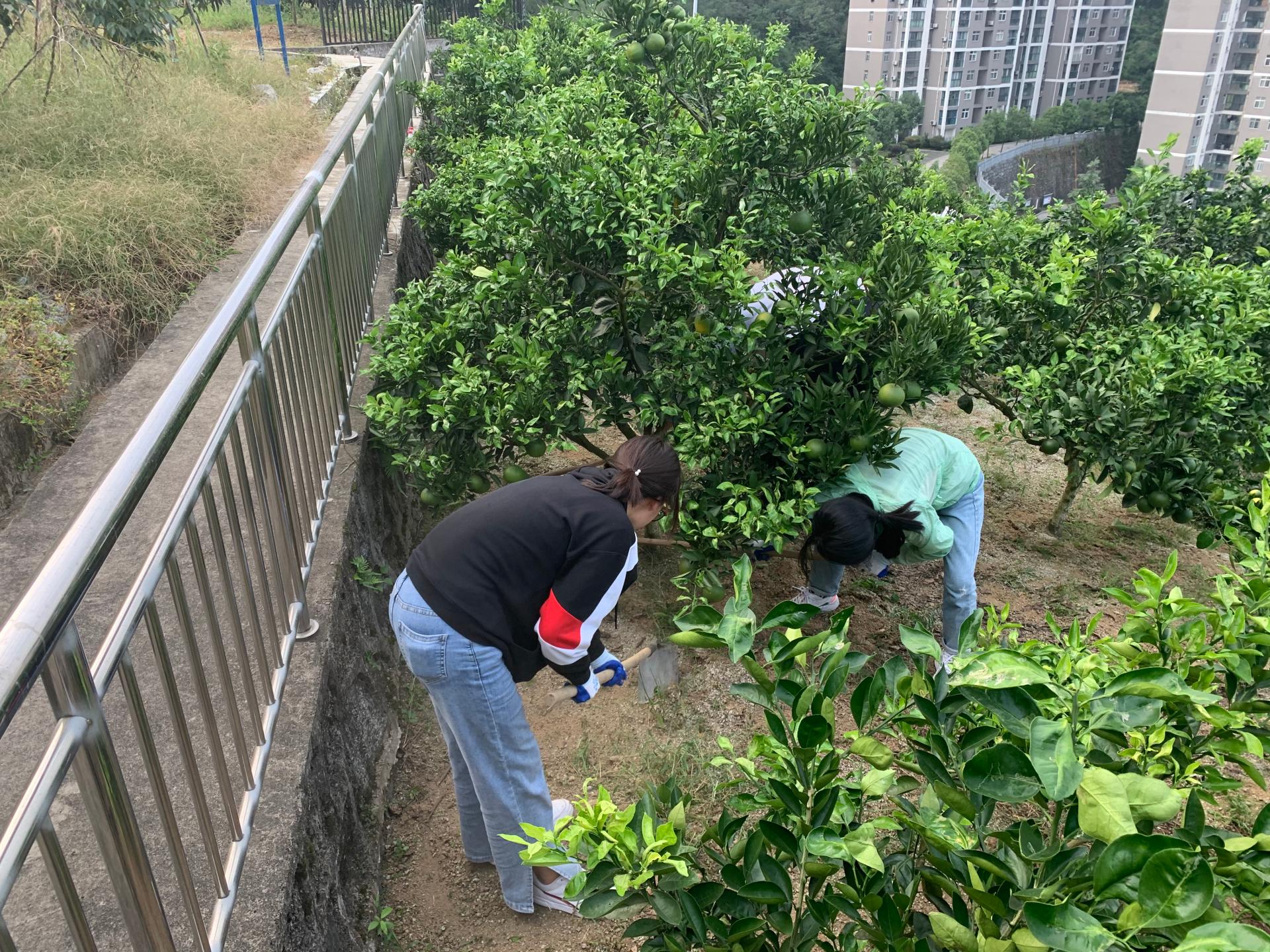 户外卫生员先是由基地外围绿化员带领着学习锄头的使用,然后再戴上手套扎进果树林,为果树拔草松土。树丛间满是同学们的欢声笑语,既有劳动的乐趣,也有同学间团结合作、互帮互助的友谊。