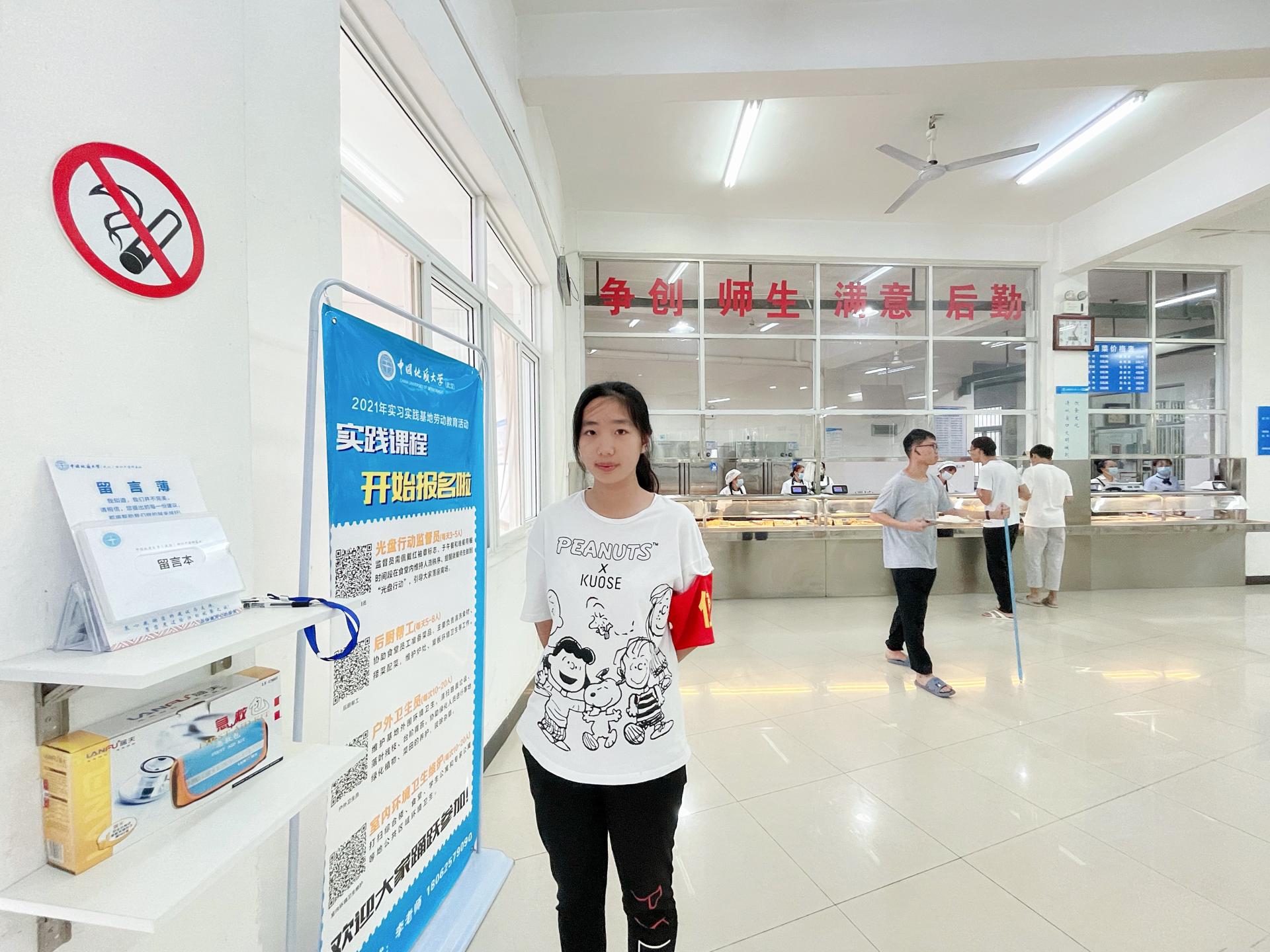 光盘行动监督员佩戴好红袖章,于用餐时间段在食堂内维持人流秩序,提醒就餐师生“吃多少,打多少,不够再添,别浪费!”,引导用餐师生真正做到“光盘行动”。