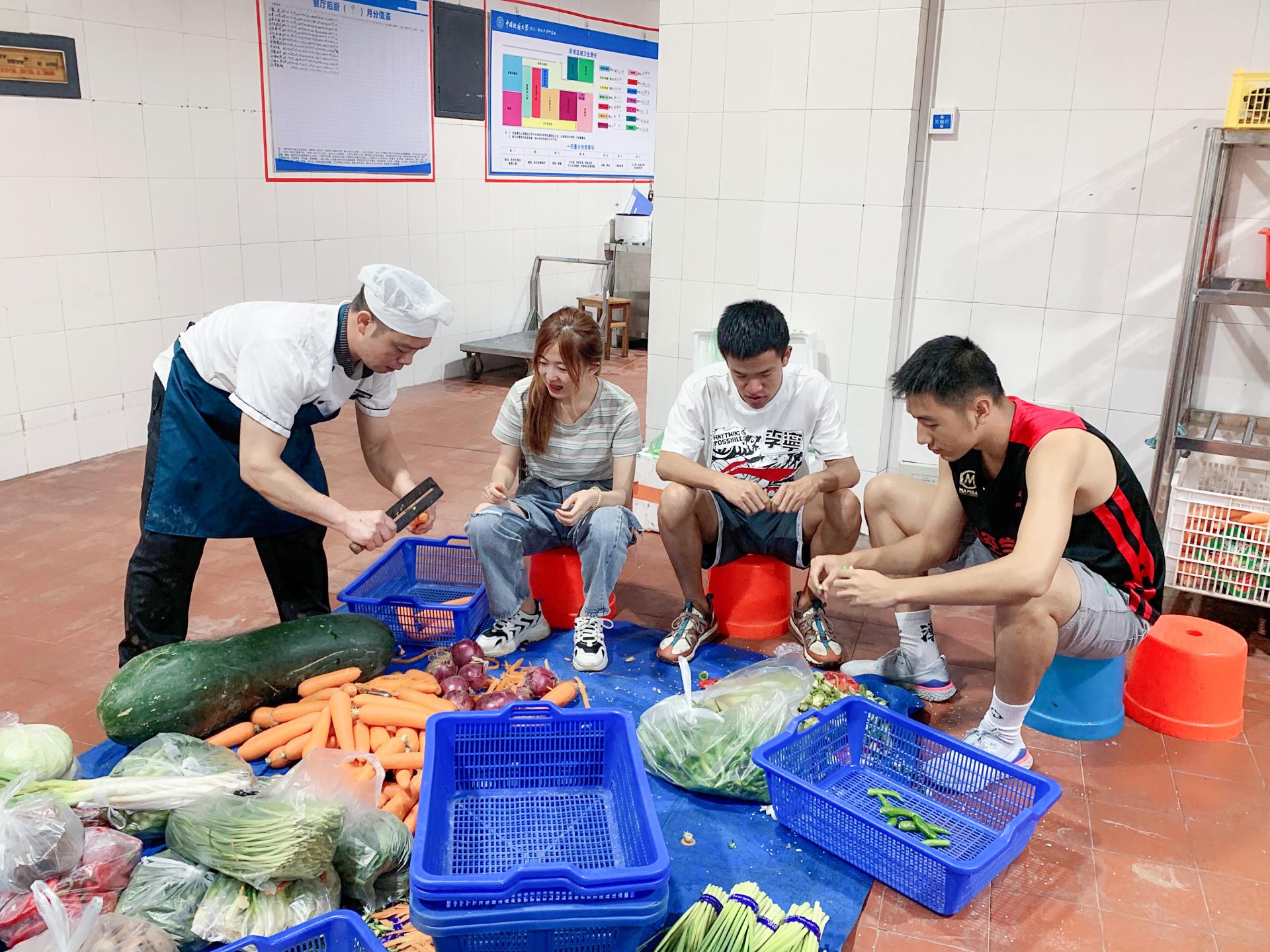 后厨帮工来到食堂协助后厨员工准备菜品,大家拿起刨刀一丝不苟地处理着食材,忙得不亦乐乎。虽然择菜只是一件小事,却能让同学们体会到劳动的辛苦和不容易,吃到嘴里的每一口饭菜都饱含着后勤工作者们的心意。