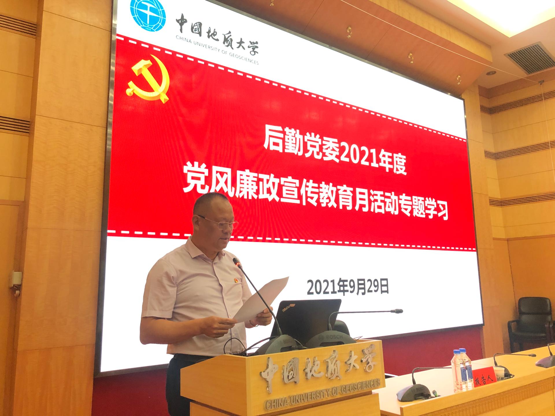 为深入学习贯彻习近平总书记“七一”讲话精神,全面推动“创清廉后勤 树新风正气”。9月29日上午,后勤保障部在迎宾楼报告厅召开党史学习教育专题党课暨后勤党委2021年度党风廉政宣传教育月活动专题学习。后勤党委全体党员、副科级及以上非党员领导干部、全体新进管理与技术人员参加学习。会议由党建人事科科长左涵之主持。