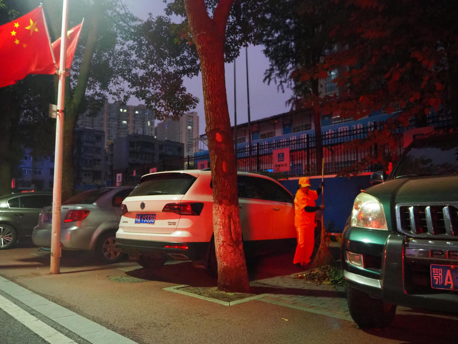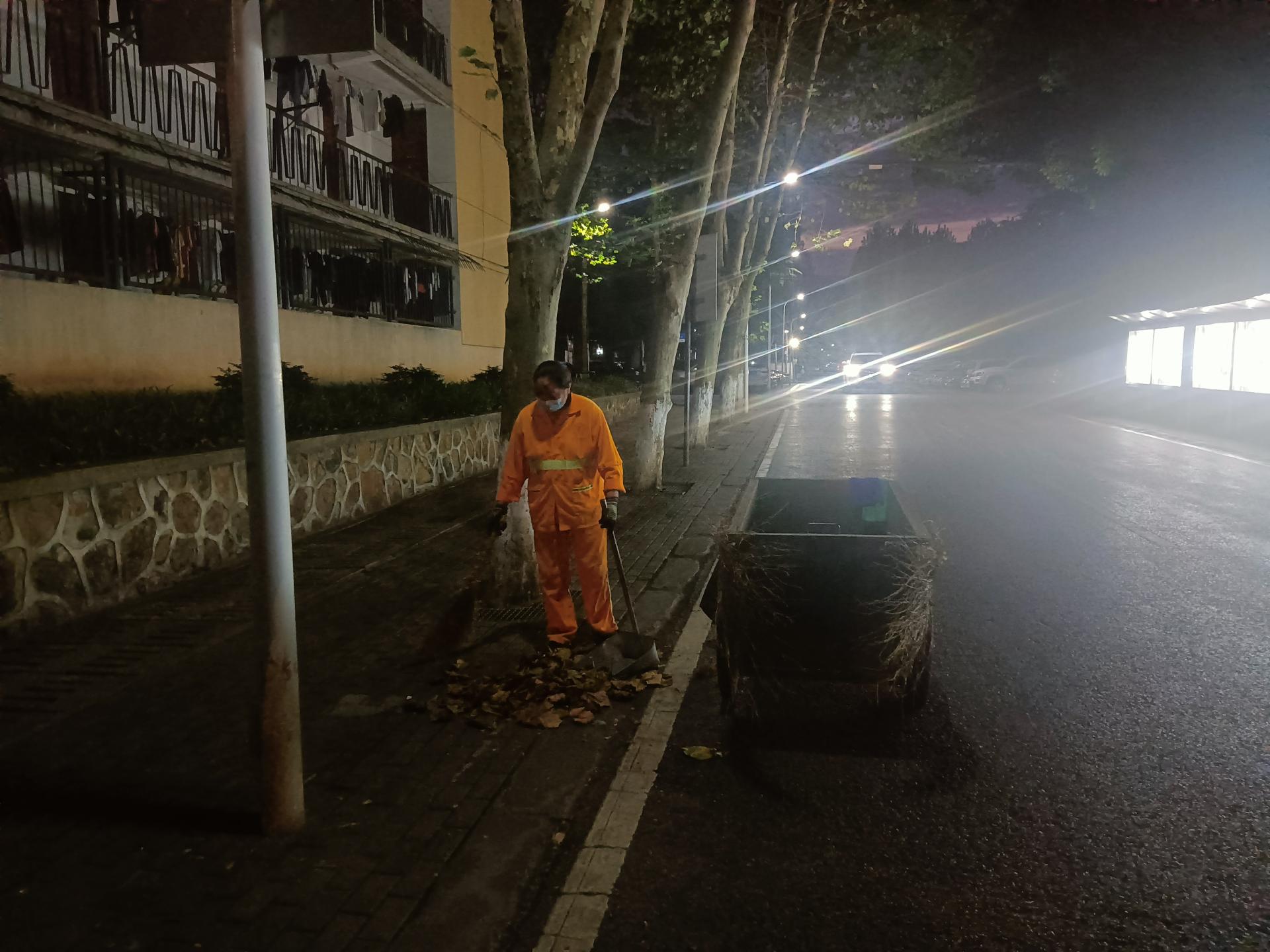 微明的路灯轻盈点缀,路灯下的人清扫着散落的残留枝叶。