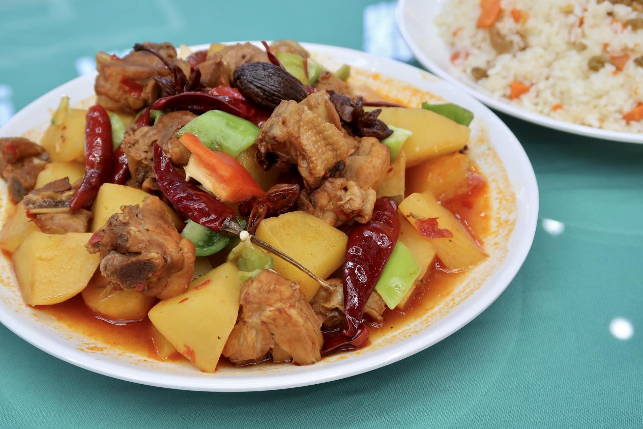 风味食品谓之特。大盘鸡爽滑麻辣的鸡肉和软糯甜润的土豆,辣中有香,不仅仅是新疆学子喜欢哦;手抓饭地道西北做法,清油、黄油、洋葱、胡萝卜和大米富含多种维生素,十分有营养;烤包子用馕坑烤制,皮色黄亮,入口皮脆肉嫩,味鲜油香;牛肉拉面汤色清气香、萝卜片洁白纯净、辣椒油鲜红漂浮、香菜蒜苗新鲜翠绿、面条则柔滑透黄,食之令人叫绝。