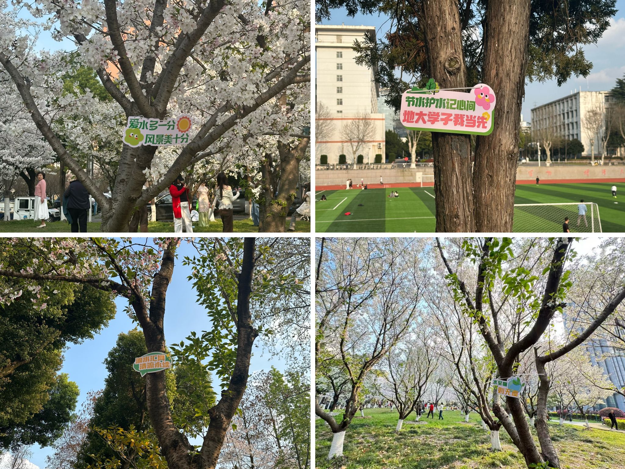 节水金句征集活动则成为全校师生抒发节水心声、凝聚护水共识的重要平台。活动围绕“节水护水”核心,结合地大校园元素征集创意文案,师生们用简洁凝练、朗朗上口的文字,诉说对地大节水的思考与倡议。为让节水金句真正落地发声,后勤保障部将获奖节水金句印制为宣传标语,在南望山校区东、西、北三个区域的重点道路及景观树木上进行悬挂,一条条鲜活有力的金句与校园美景相映成趣,既美化了校园环境,又让节水宣传触手可及,让每一位师生在行走间感受节水氛围,将节水理念内化于心、外化于行。