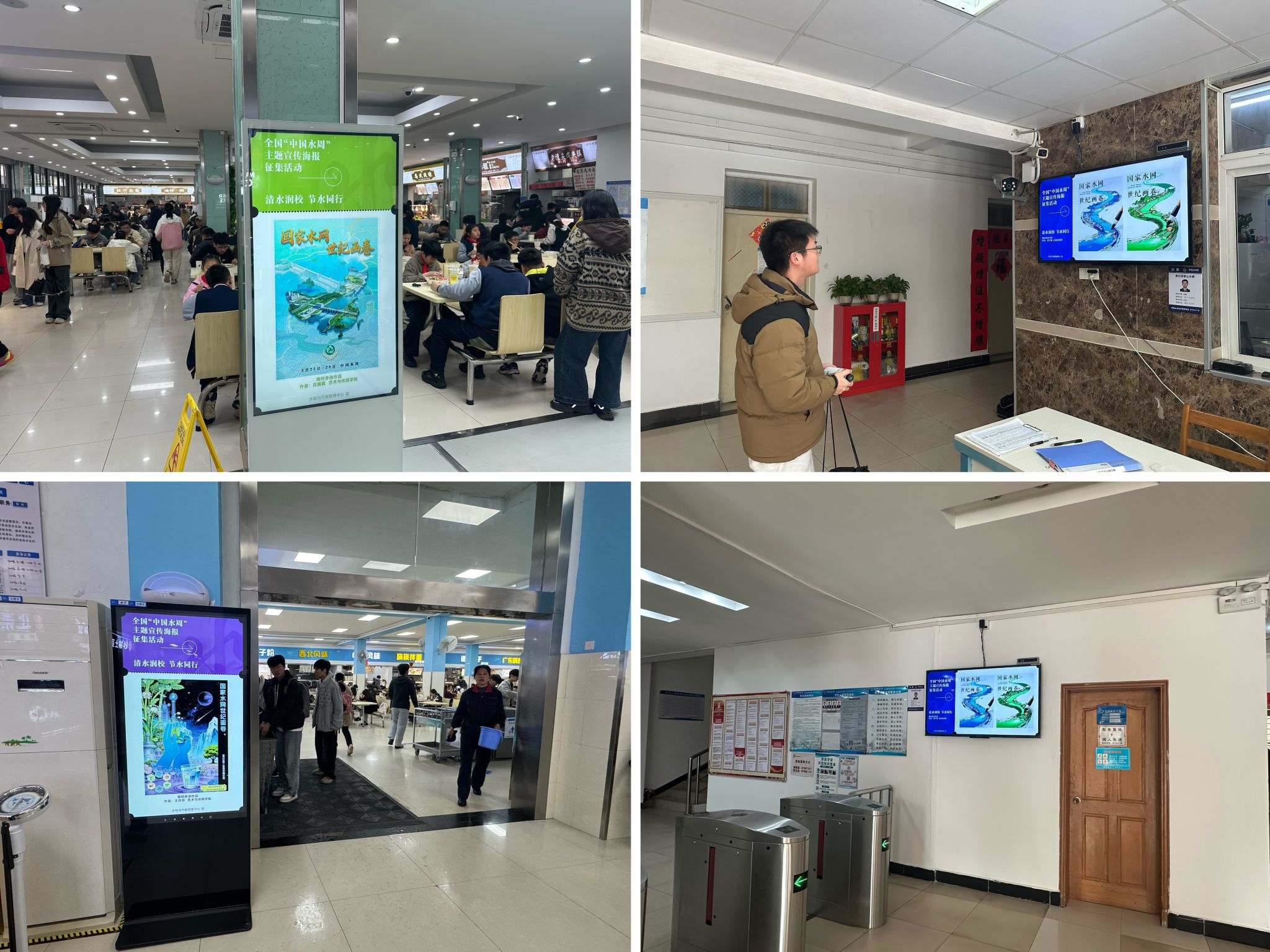 本次节水宣传紧扣水利部主题号召,结合校园实际策划丰富活动内容,全方位调动师生参与热情。在水利部宣教中心“国家水网 世纪画卷”主题宣传海报征集活动中,后勤保障部精心组织、广泛动员,发布专门推文面向全体师生发起报名号召,最终推选3套优秀作品参与全国评选。其中,艺术与传媒学院学生王亦菲和水电与节能管理中心员工程子蕴创作的2套作品,从全国200余套作品中脱颖而出斩获奖项。艺术与传媒学院学生庄翼翼的作品也凭借独特的设计巧思展现了地大师生的专业素养。目前,获奖作品及优秀参选作品均已在学校食堂、宿舍等公共展示区进行陈列,成为校园里一道兼具教育意义与艺术美感的风景线,让师生在驻足观赏中深化对国家水网建设的认知。