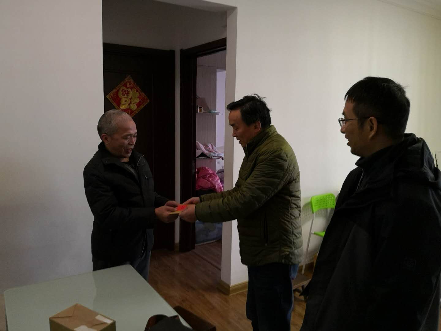 1月29日上午,蔡楚元同水电与节能管理中心党支部书记王仲文等赶往武汉市东郊的一社区,看望、慰问居住在女儿家中的退休职工张来运师傅。张来运师傅退休前是我处的优质服务明星,连续6次获得学校“三育人标兵”荣誉称号,多次被评为优秀共产党员。张师傅患有严重哮喘病,身体状况不佳,党组织十分牵挂。蔡楚元等关切地询问了张师傅的身体及治疗情况,代表党组织衷心感谢他长期执着服务、辛勤工作、屡创佳绩,叮嘱他及家人树立信心,早日战胜疾病恢复健康,并祝张师傅一家新春快乐,新年吉祥!