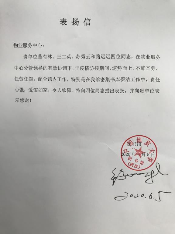 6月5日,物业服务中心收到来自中国地质大学(武汉)图书馆的一封表扬信。感谢信中对图书馆保洁员董有林、王二英、苏秀云、路远远的工作给予了肯定,赞扬他们在疫情防控期间,逆势而上、不辞辛苦、任劳任怨,配合馆内工作,特别是在图书馆密集书库保洁工作中,责任心强,爱馆如家,令人敬佩。