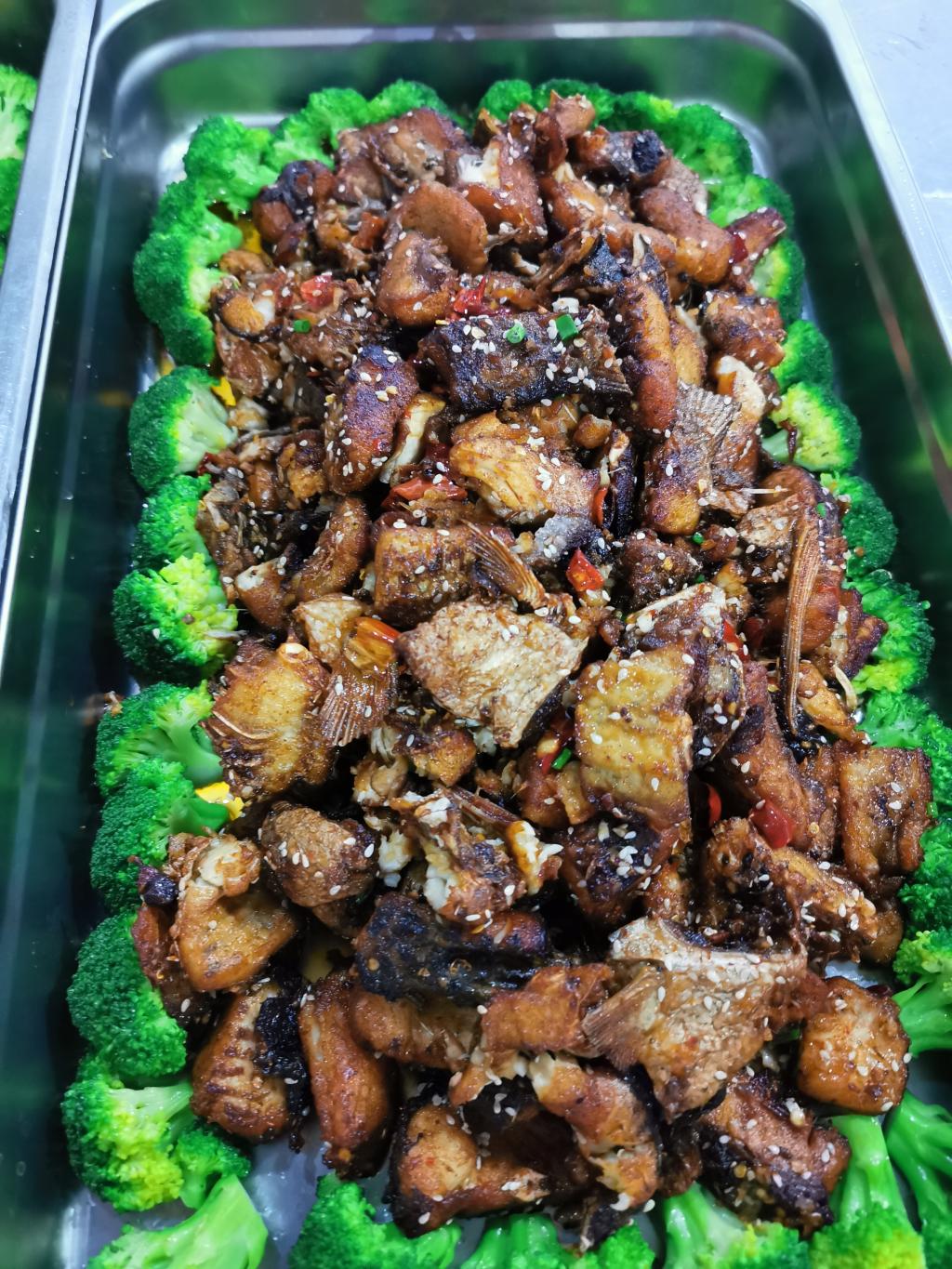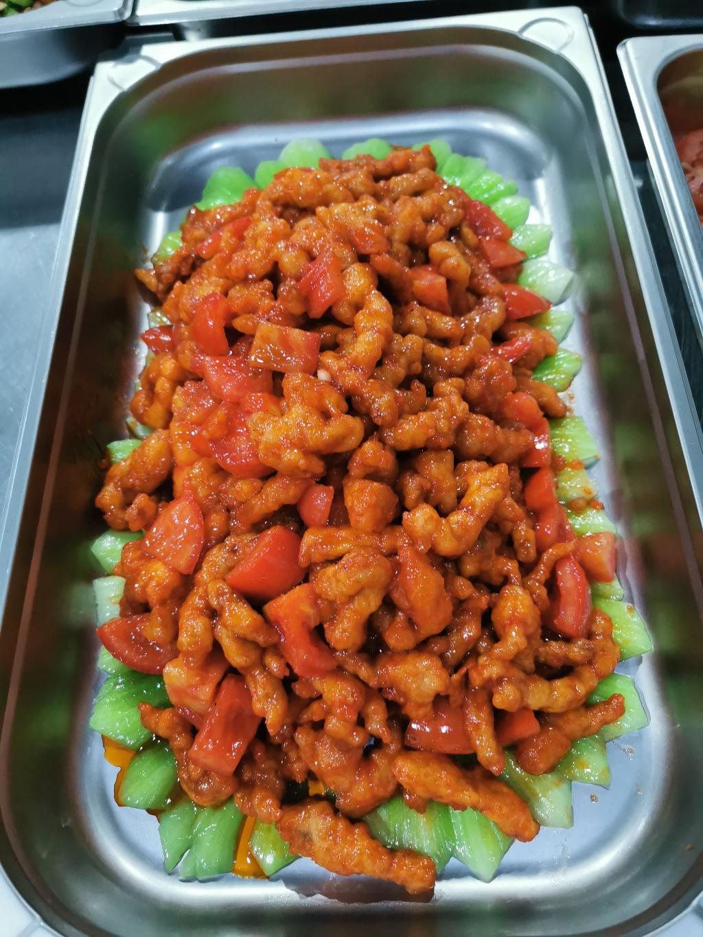 首先一道酱汁浓郁的糖醋里脊,以新鲜的时蔬上海青打底,鲜嫩的青菜搭配,油而不腻,甜酸爽口。接着是干烧芝麻鱼块,以新鲜的西兰花打底,芝麻的香味和鱼块融合在一起,既去除了河鲜的鱼腥味,又使得鱼肉鲜嫩爽口。还有白玉烧排骨,金玉满堂,宫保鸡丁,苦瓜烧排骨等,一道道美食依次排列,静待着老师评委们的品尝,当然,新鲜蔬菜搭配必不可少,手撕包菜,篙芭炒肉等,合理的荤素搭配营养更加健康,餐后水果是必须的,当然选库尔勒的香梨,圣女果,以及酸香满口的酸奶,可以促进消化,让大家大快朵颐的同时又兼具营养荤素的搭配。