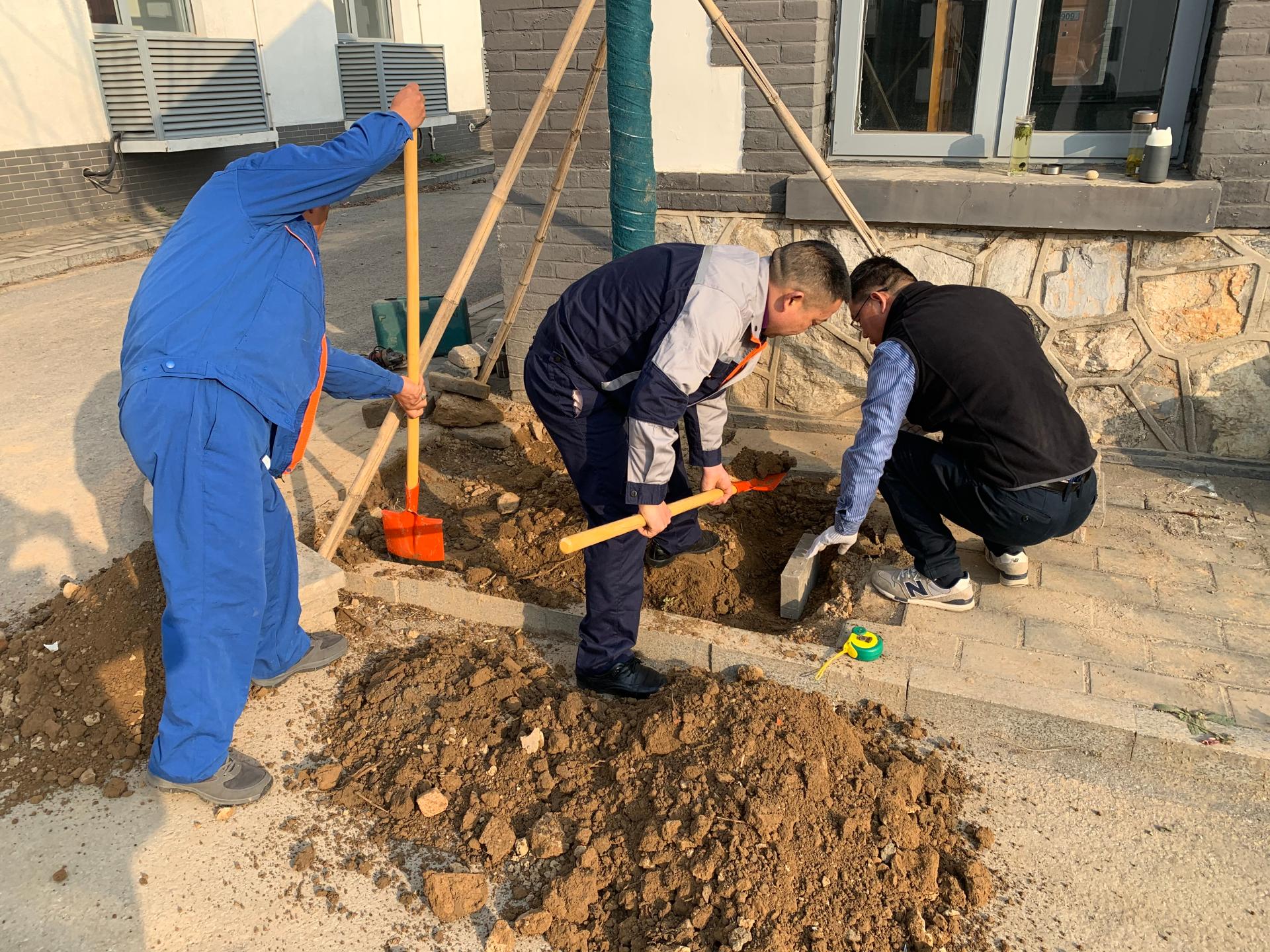 4月8日上午,大家首先对开春为栽种树木开挖的外围地砖以及坍陷变形的路面重新进行铺设。搅拌泥沙、挖土搬运、砌石铺设,各个小组分工明确,各项工作有条不紊。虽然近日北京气温尚好,但在长时间户外作业中,阳光照在身上,每个人身上都浸满了汗水。经过四天的集中修缮,基地内共20余处地砖恢复平整。