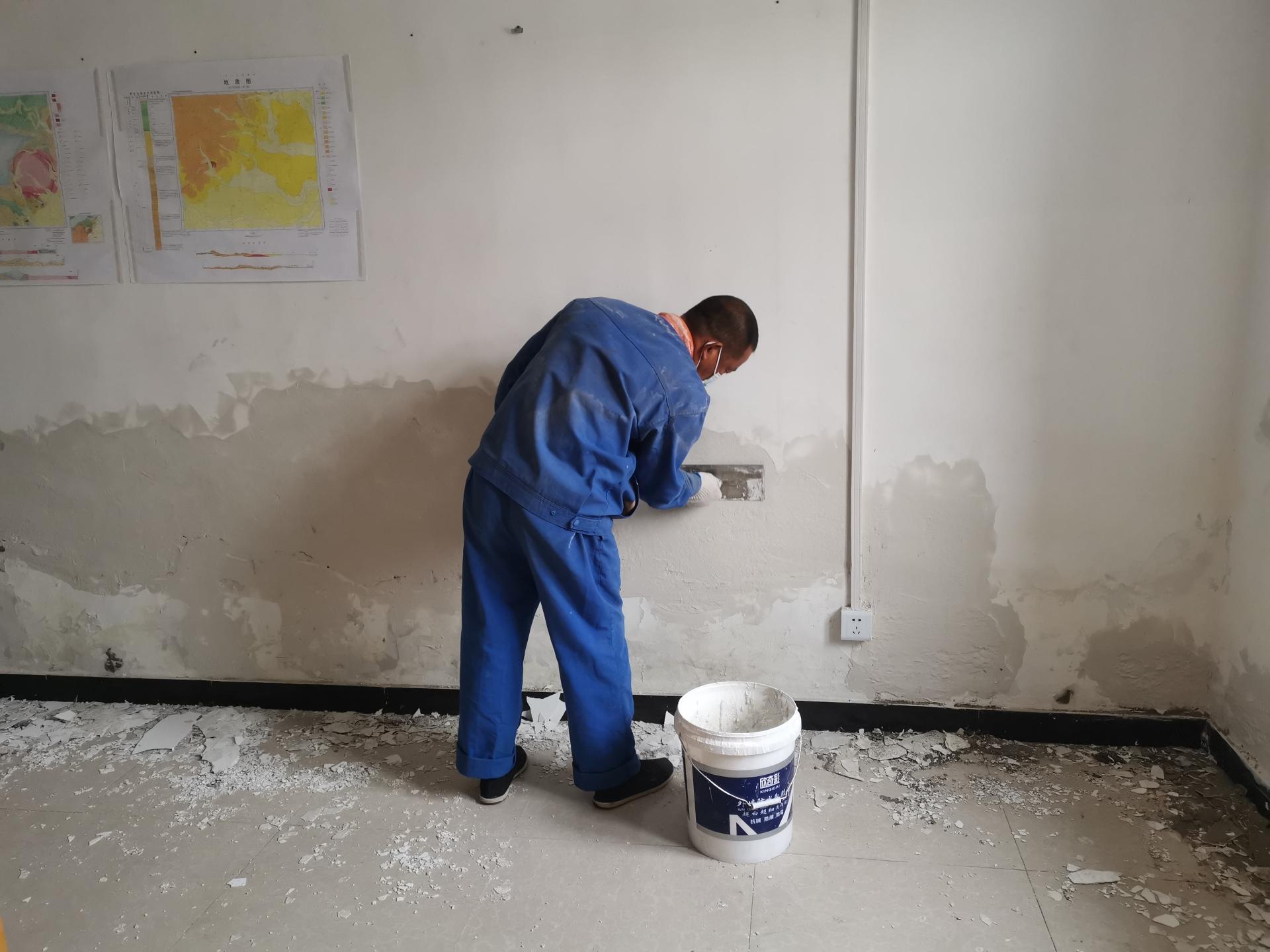 周口店基地教室、宿舍的墙皮脱落情况较多,经过统计,需要重新粉刷的墙面约800平方米。此外,部分房屋屋顶管道堵塞,瓦片脱落,有10余处存在积水、漏水现象,严重影响正常的教学实习生活开展。针对大范围起皮脱落的墙面,维修师傅刘保山、黄厚国用工具一一铲除剥落破损墙面,打磨后重新粉刷。维修部经理陈艾甫和物资部经理王福登上房顶,对堵塞的管道进行清淤、疏通,更换破损瓦片并进行加固。