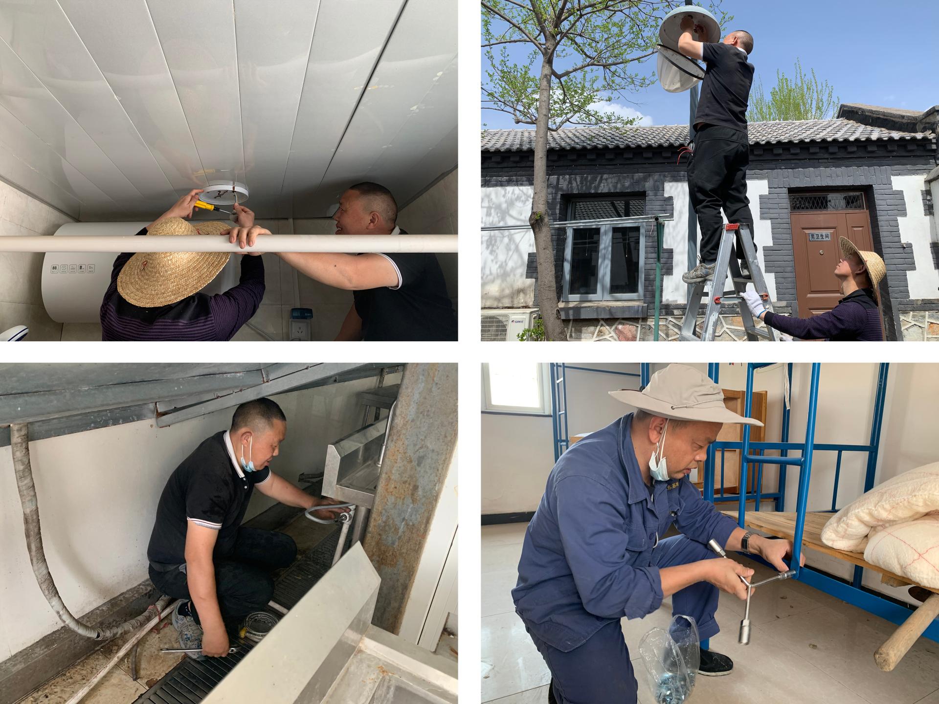 在紧锣密鼓地完成了地砖铺设、路面修补、墙面粉刷等大量基础设施维修工作后,中心副主任朱响林等人来不及稍作休整,又对基地教室及宿舍水电设备、食堂厨具设备、燃气安全、排水排污管道等进行了一次全面排查。排查中发现多处灯具、家具损坏,污水管道淤堵等问题。由于此次来周口店基地时间紧、任务重,为确保按计划完成全部维修任务,大家采取多线并进方式,对于需要专业设备支撑的管道疏淤项目,立刻联系管道疏通公司开展疏通工作,能自行维修的项目,则全员齐上阵,分组推进各项维修工作。