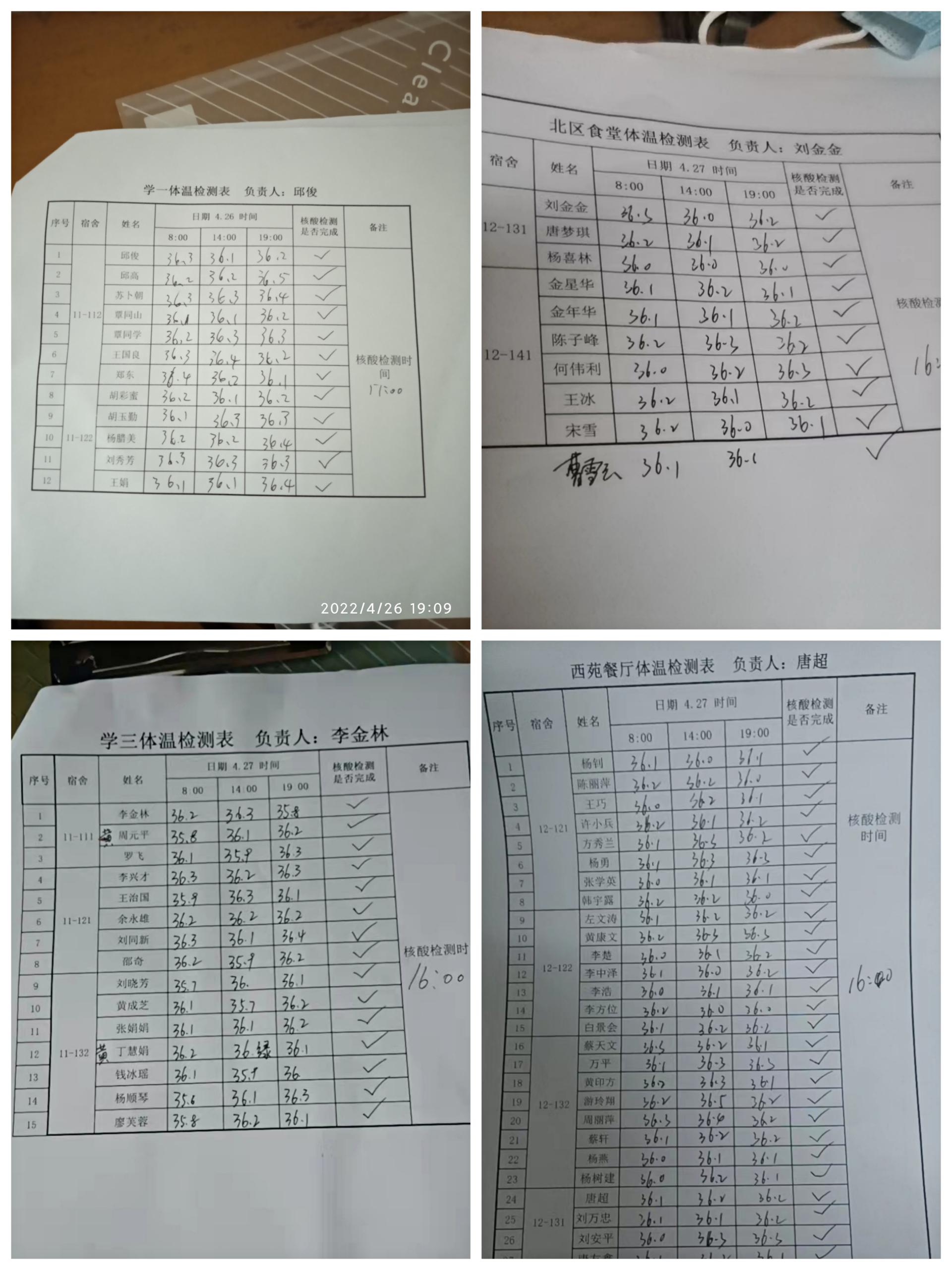 这些都是饮食服务中心隔离群中每日上演数次的对话,中心班子成员心系隔离员工,俨然成为大家的“贴心管家”,每日关注隔离点动态,带领各食堂隔离负责人一起,严格落实科学疫情防控政策。针对隔离人员,中心坚持每人每日测量体温三次并统一记录在“体温检测表”上;每人每日坚持核酸检测,由各食堂负责人监督,确保不漏一人;每日检查、统计健康码情况,并及时跟进转码情况。中心精准落实疫情防控政策,消除隔离人员内心的不安。