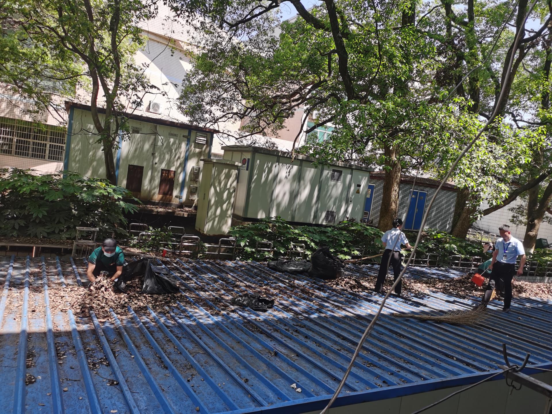 西区幸福公寓一侧的维修工作间,因处于茂盛树荫下,不多久楼顶就积累了一层厚厚的树枝落叶。为给居住员工一片干净整洁的生活环境,在办公室的组织下,各部门员工积极参与,大家不惜牺牲午休时间,共同携手,高效、高质量地将落叶及垃圾清扫干净。