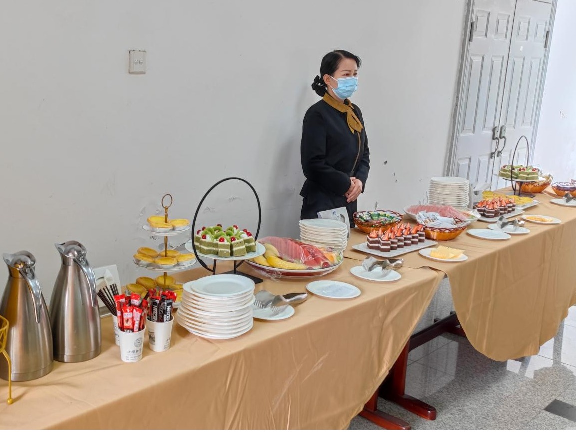 为减少人员聚集,本次培训班的用餐以分批分流的自助餐为主。会议当天,餐饮部经理合理调配人员,科学把握就餐时间节点,商务中心业务员全程实时跟进协调,及时处理用餐突发状况,保障参会人员享用美味而又有温度的餐饮服务。