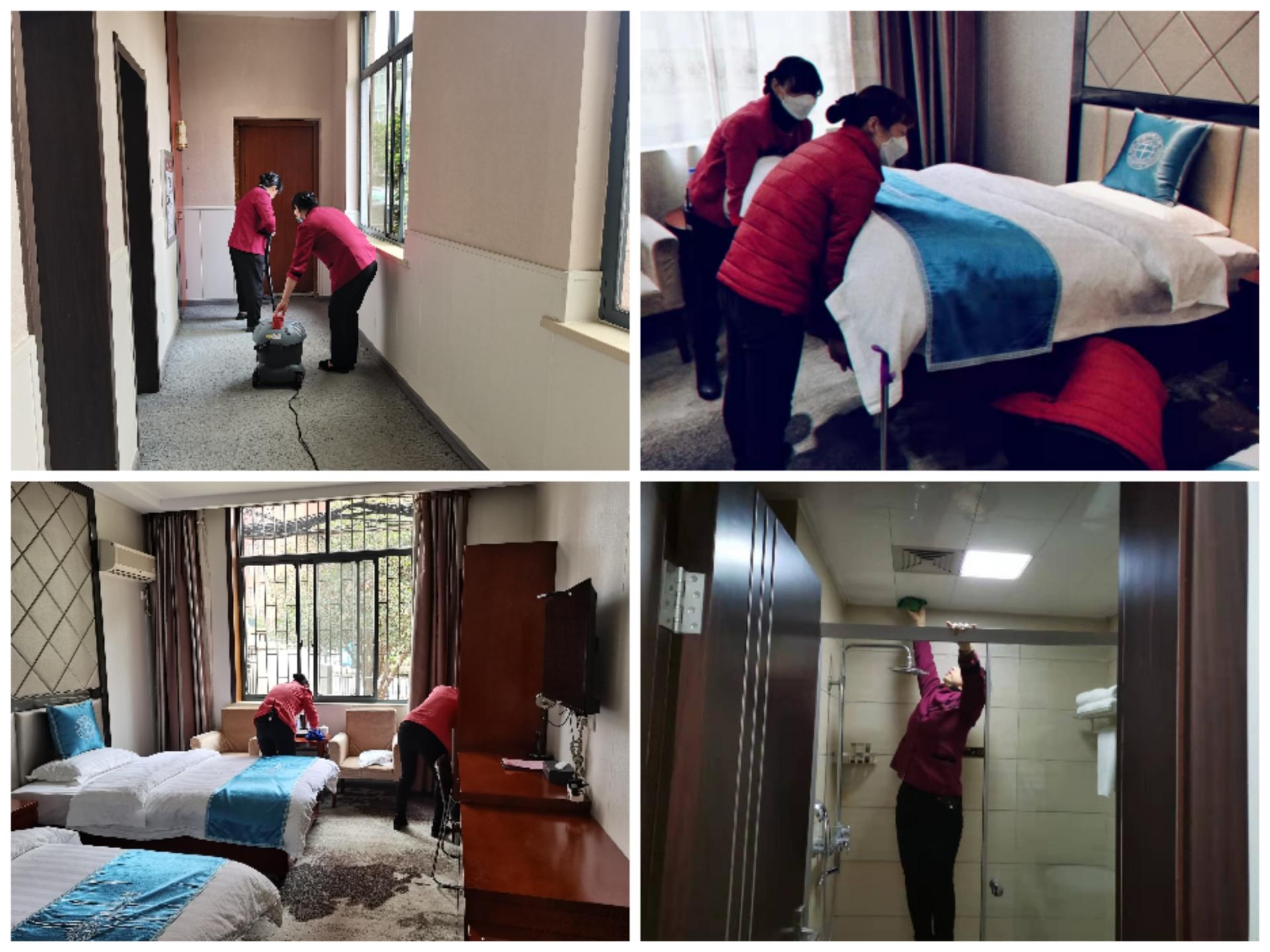 严格落实日常保洁、环境卫生整治和清洁消杀等措施,为了使宾客享受到干净、舒适、安全的入住环境,让与会领导及老师更为舒心、放心的参会,客房部楼层班组及前台班组分别对所有客房及会议室逐一开窗通风、抹尘,对室内设施设备一一检查,进行全面消毒消杀,做到不遗漏、无死角。