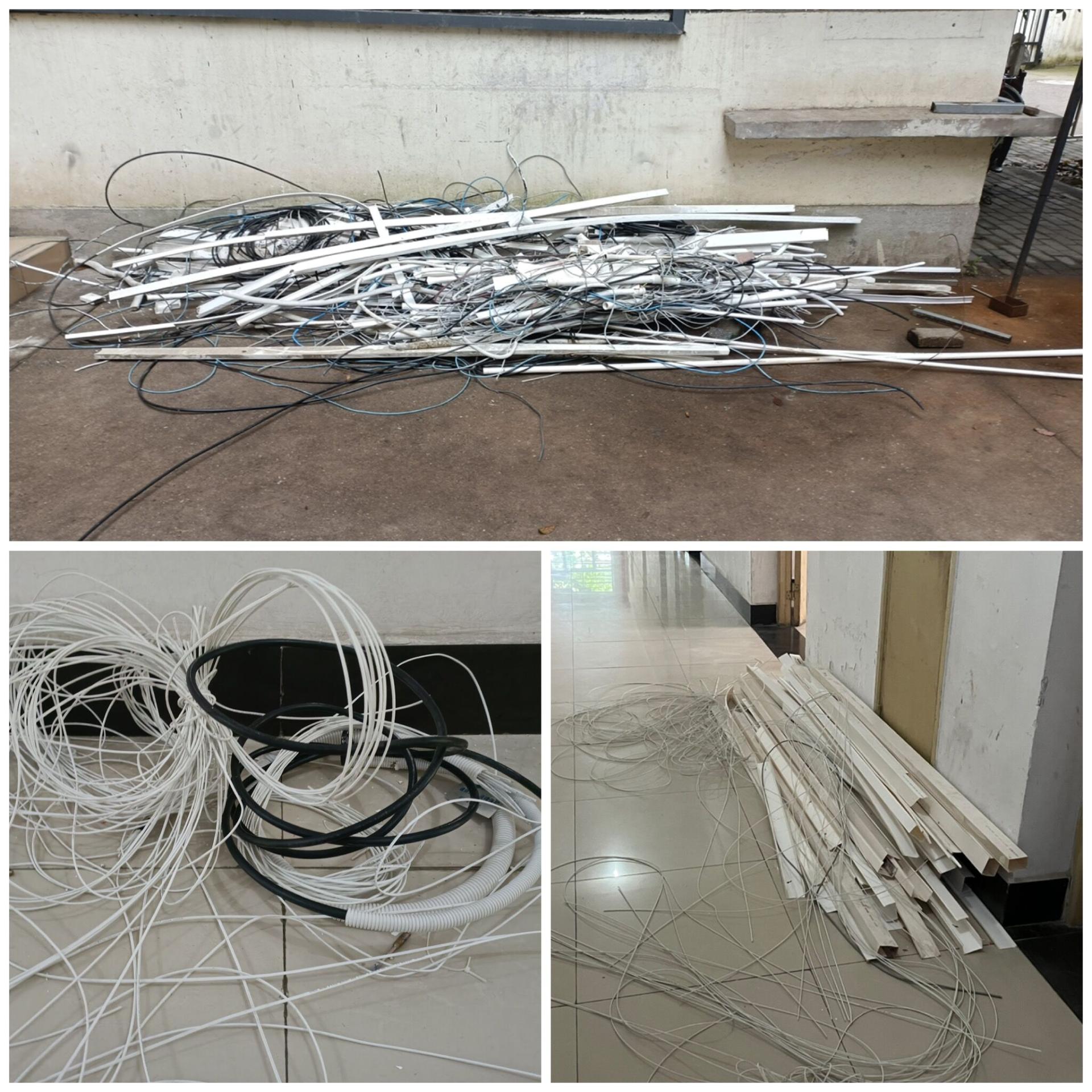 5月17日,中心组织专业团队入场,面对宿舍楼内纵横交错、上下重叠,多家运营的设备和线路,在清理过程中安排专人参照校园管线入地实施要求,积极主动的与校信息化工作办公室、中国电信、中国移动多家运营机构负责人协调沟通,对闲置废弃设备和线路进行拆除确认,对继续使用的进行成品保护。截至目前,经过师傅们的耐性细致的分拣梳理,拆除治理,已完成6栋楼的清理工作,清理了废旧管材3车。整个清理过程平稳有序,整改后的公共区域整洁明朗,也得到了同学们的赞扬。