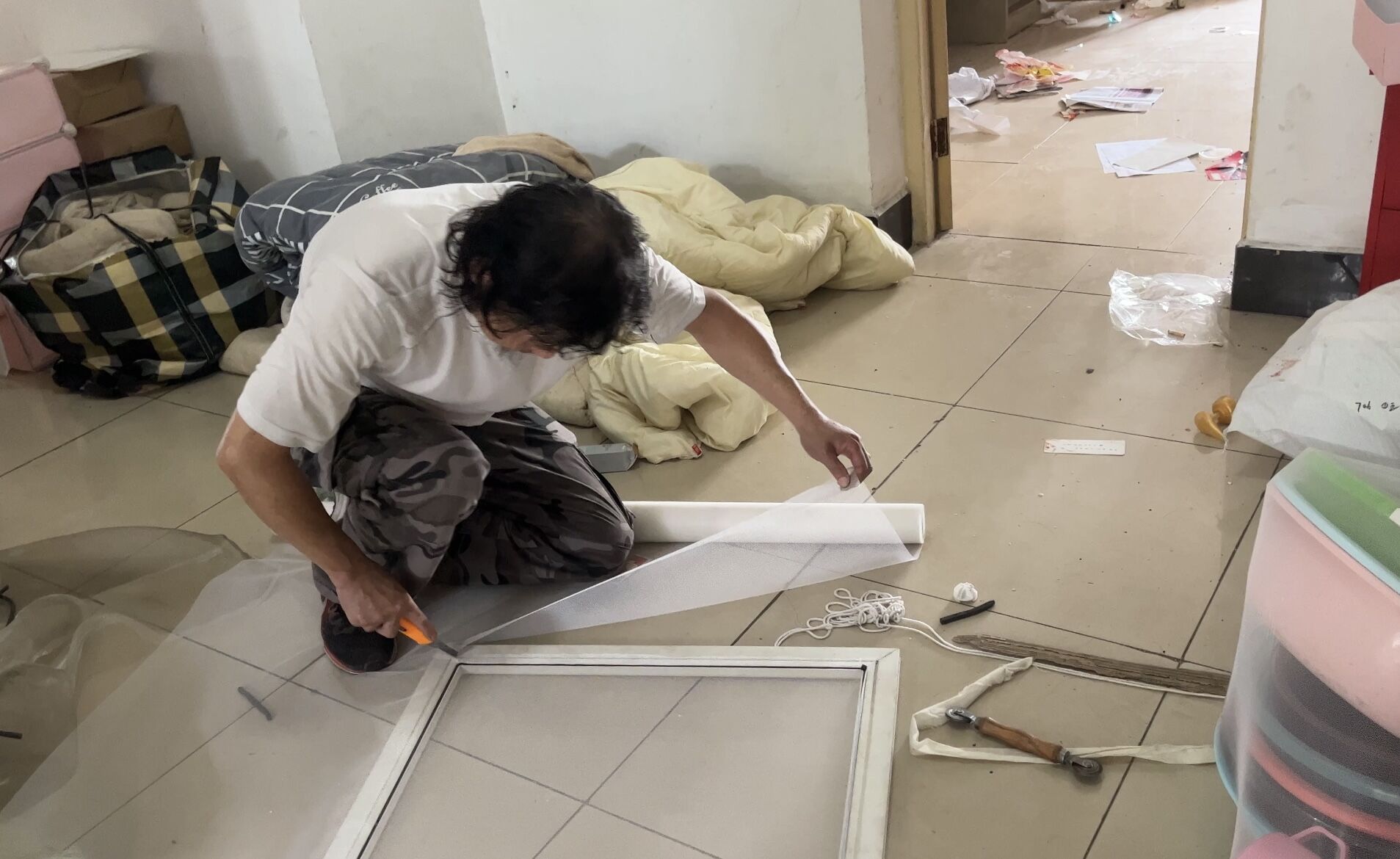 打开房门,房内一片狼藉,保洁员们立即卷起袖子,带着口罩,忍受着高温和刺鼻的味道,对房内废弃物品进行垃圾分类、打包、清运。由于废弃垃圾量特别大,保洁员用废弃的床单包裹着垃圾,托在肩上往返于房间与垃圾车之间,一袋都有一百来斤,不一会儿汗水就浸湿了头发和衣服。为了确保新生房维修队在7月16日顺利进场维修施工,她们挥汗如雨战高温,不怕累、不怕脏,加班加点,尽职尽责做好清理工作,成为学生公寓里一道独特的“蓝色”风景线。