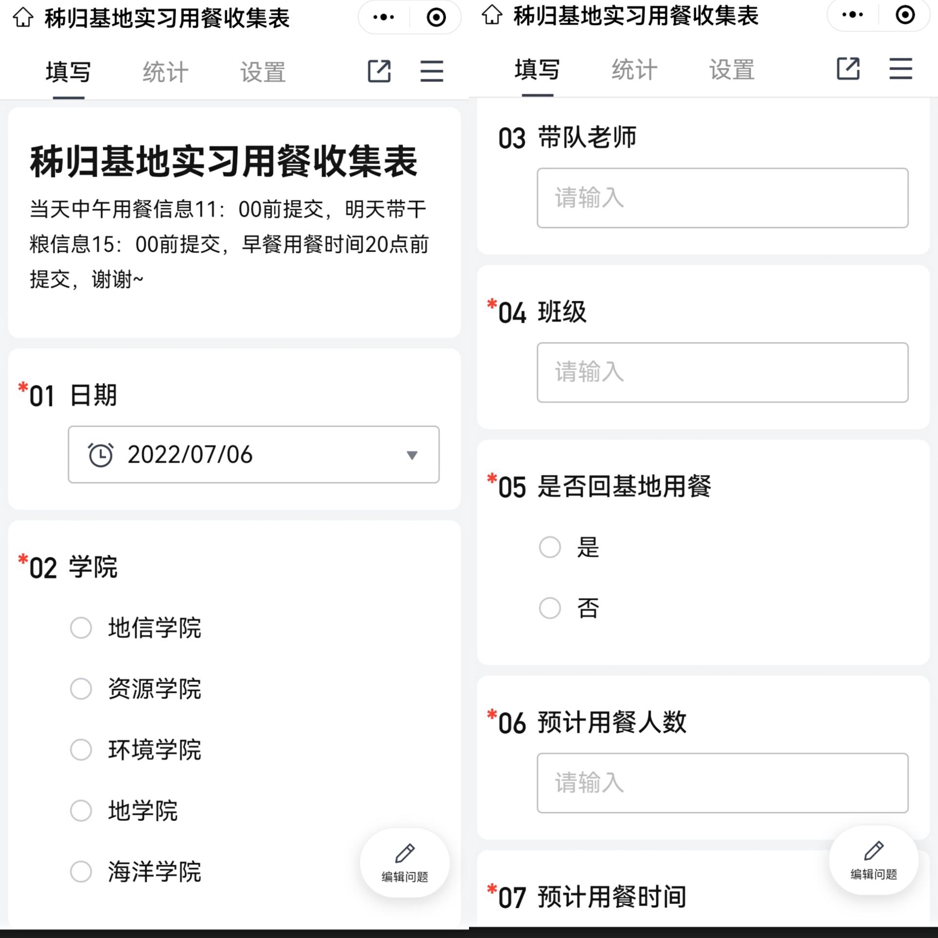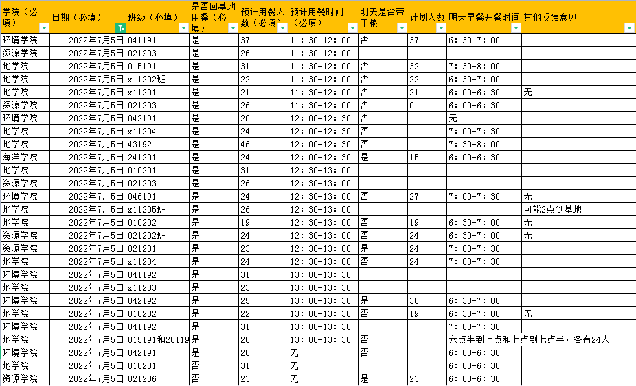 实习高峰期,秭归科教基地在站师生多达一千人。由于各个班级野外实习教学计划不同,每天就餐人数及时间浮动较大,各时间段备餐分量也难以把握,容易出现食物浪费、菜品出炉时间不确定及服务效率低等多方面问题。为此,今年秭归基地经过周密的前期调研,推出食堂订餐小程序。实习师生在小程序填写每日每顿的用餐时间、用餐人数,并可提前预约第二天出野外带干粮等,数据可实时更新;食堂工作人员查看后台汇总数据后,灵活调整备餐量及营业时间。“早餐能提供豆皮吗?”“明天想喝绿豆汤”“小炒窗口供应分量太足了”......一条条留言反馈涌进后台,食堂工作人员在第一时间做出回应,积极改进菜品服务。