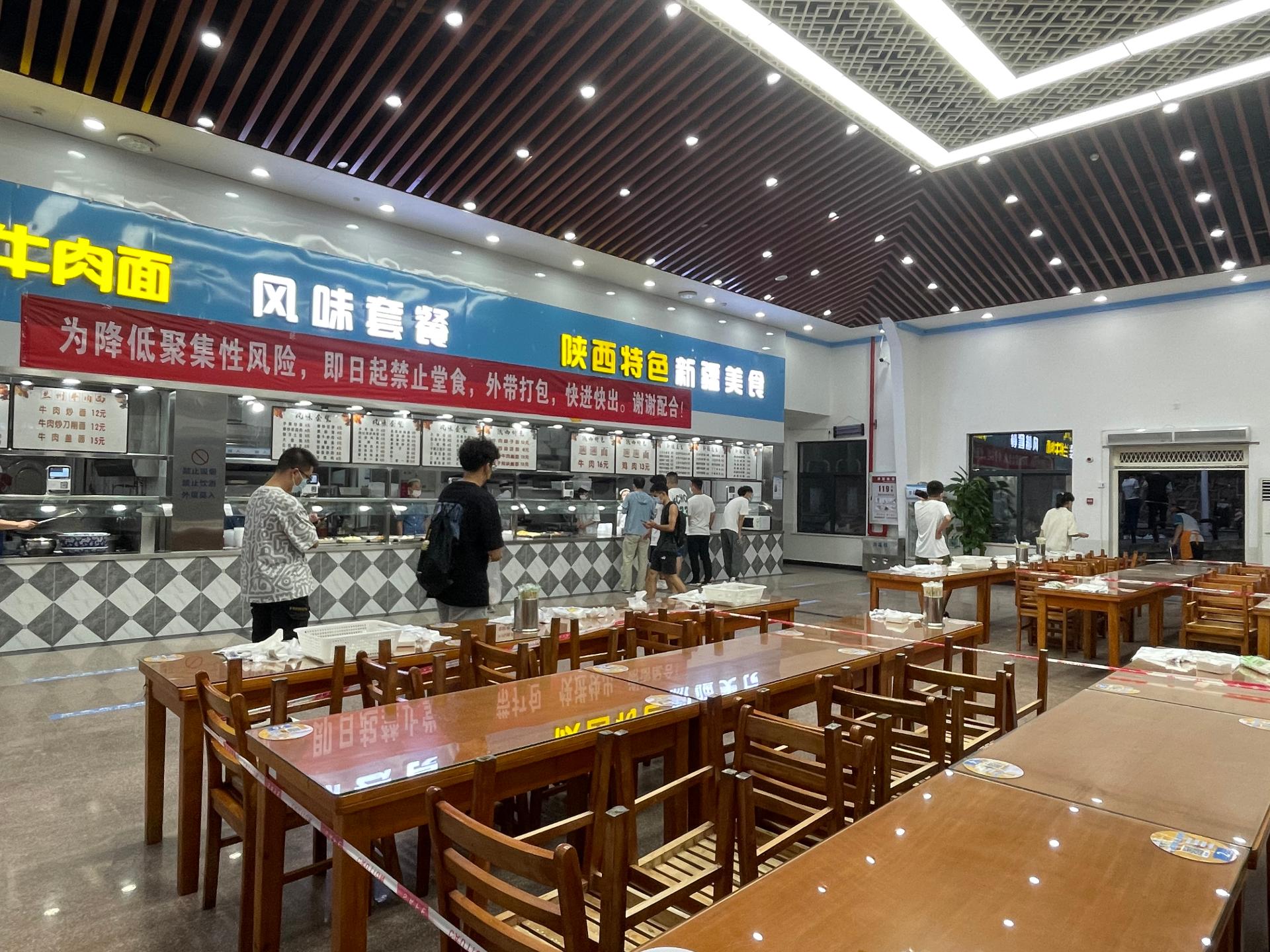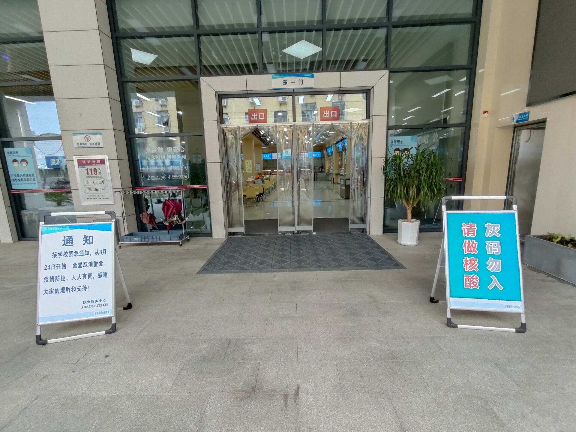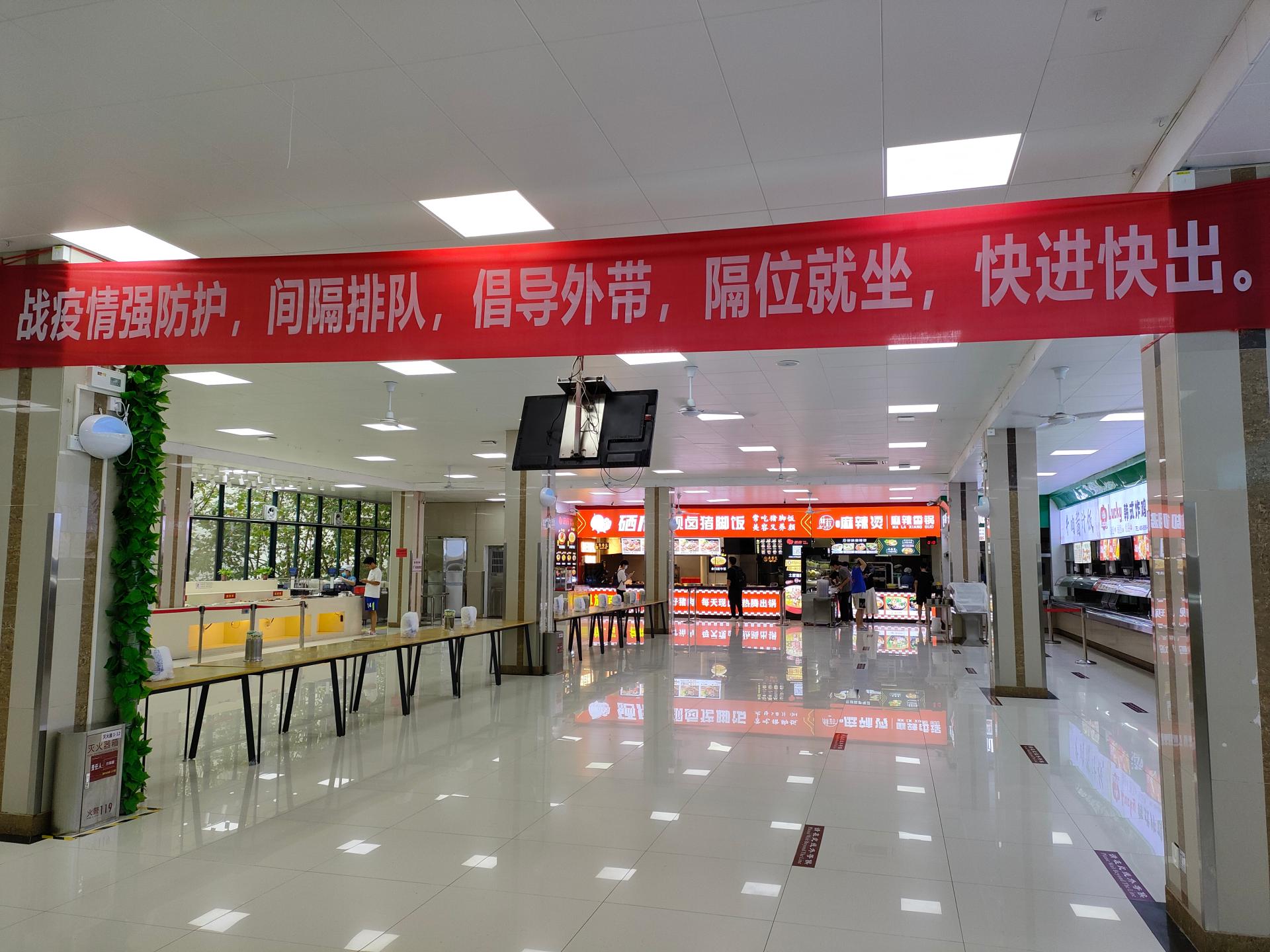 为强化疫情防控,各食堂门前统一安放“食堂取消堂食”宣传标语、电子屏播放统一提示“禁止堂食、外带打包”;安置就餐物理隔离带、设置打包台,管理人员有序引导师生、家长排队购买,打包带走。