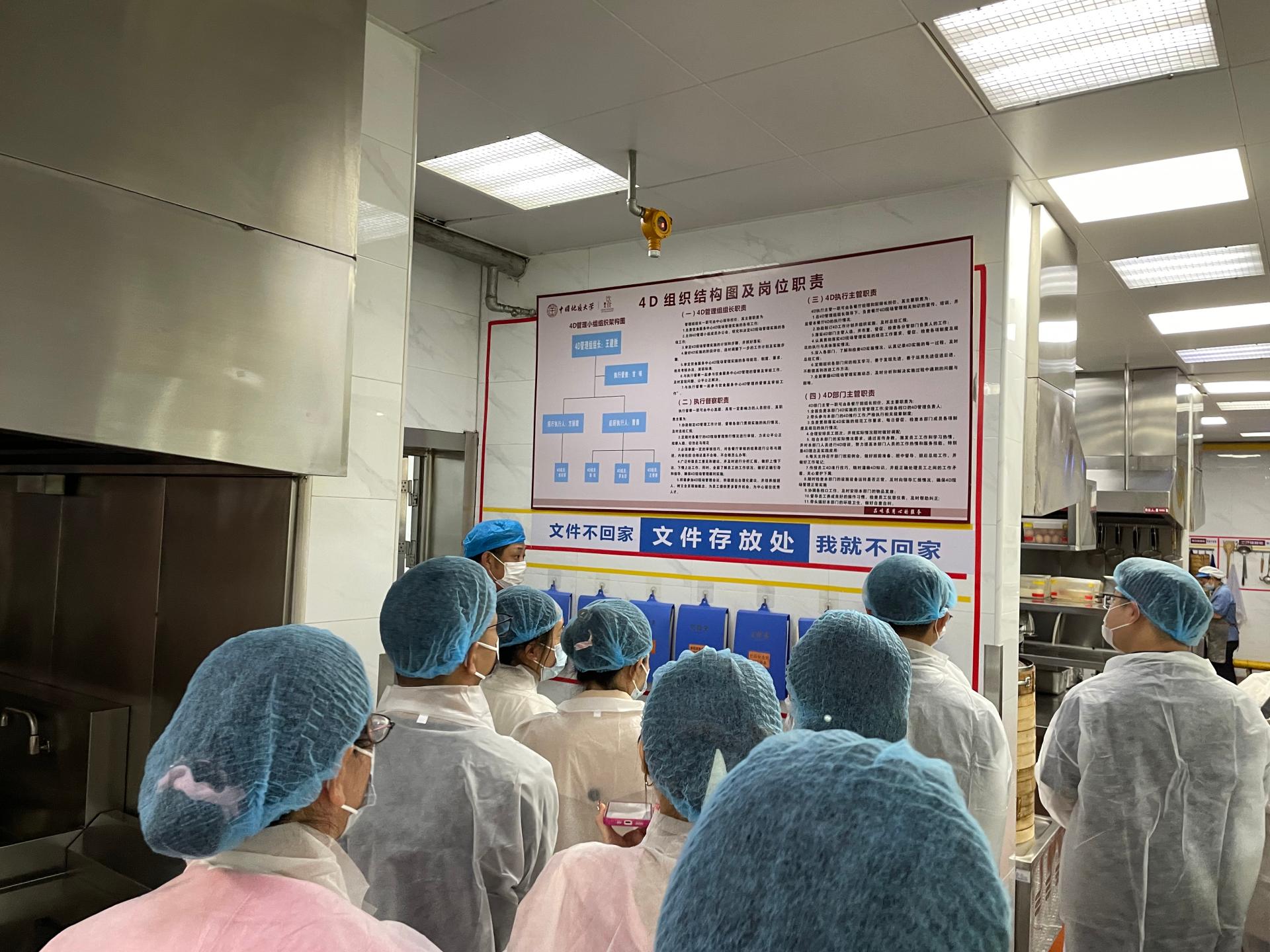 随后,东苑餐厅厨师长曹勇带领大家参观食堂,一一介绍了食品原料仓库、食品安全台账、清洗加工、备餐和洗碗等工作环节。参观现场可以看到厨房地面滴水不沾、干净干爽,厨房用具摆放得有序,各种设施设备高效先进,各项管理制度严格完善,大家惊讶之余纷纷叹服于厨房的精细化管理。