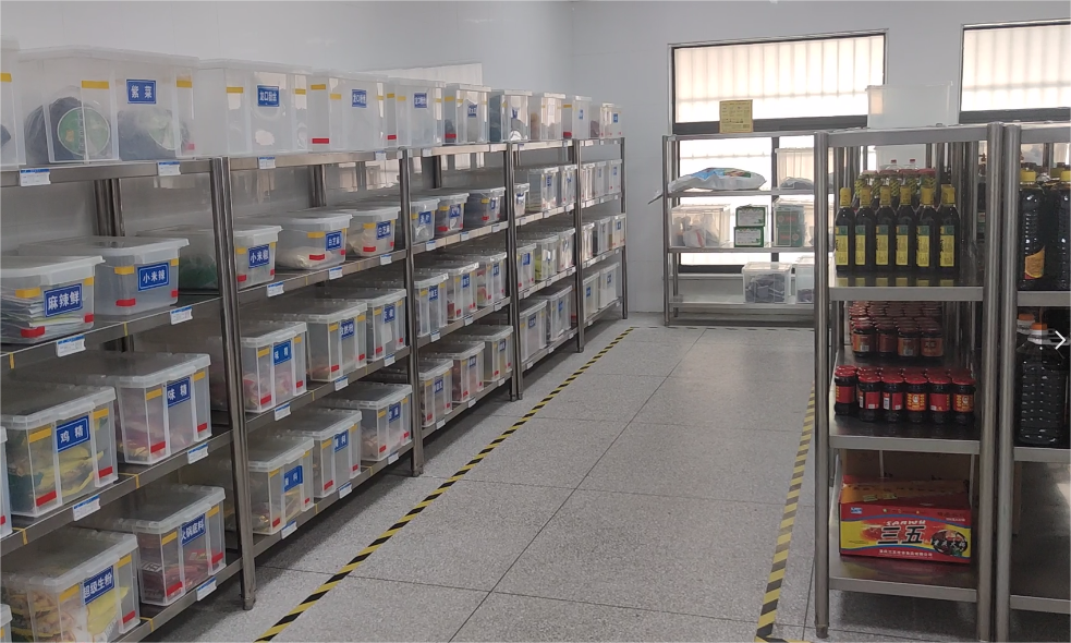 后厨大门旁的“互联网+明厨亮灶”视频监控屏幕,方便大家随时在大厅查看后厨工作场景,让师生们放心饮食。走进西苑餐厅后厨,映入眼帘的是文件存放处,“文件不回家,我就不回家”几个大字时刻警醒大家注意工作记录;“小碗菜”烹饪间,琳琅满目的菜品整齐摆放,厨师们分工明确,在这三尺之地展示“十八般武艺”;粗加工间,地面干净明亮、无水无油,真正将“无水化厨房”践行到底;荤食加工间荤素分开,保障师生舌尖上的安全;冰箱存放处的每台冰箱上都有责任卡,责任要求、清洁说明,责任人标识清楚,真正做到“责任到人”;晨检区,餐厅“区域4D责任图”及“色标管理规定”上墙,让4D管理深入人心;餐厅仓库,物资摆放整齐,每种原料都配有标签卡,将原料品名、生产日期、保质期等清晰标识,方便查找。