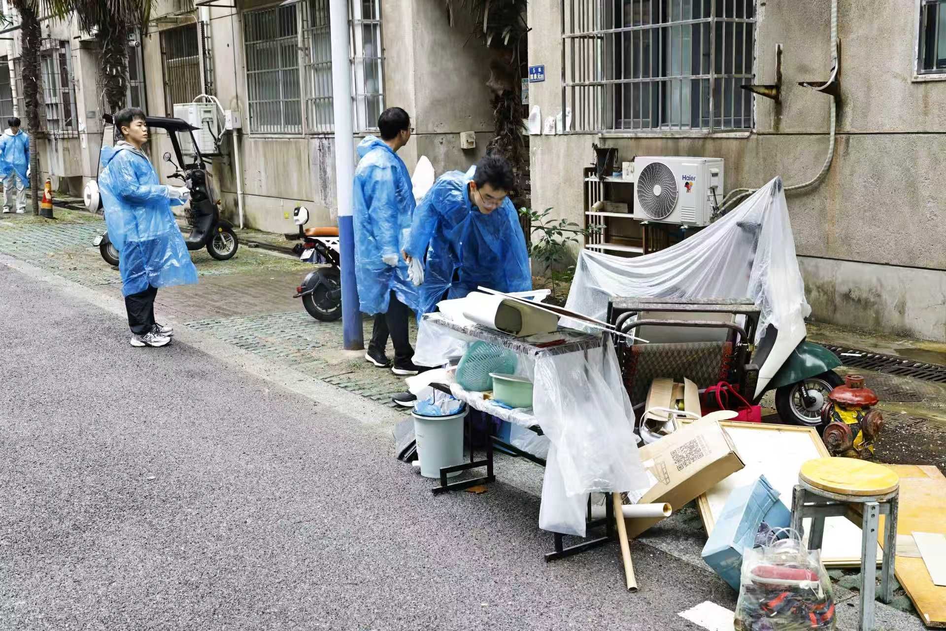 活动当天雨势渐大,社区工作人员提前到场分发雨衣,在新综合楼前完成分组,每个区域均安排 1 名社区骨干统筹协调。“一组 12 名同学这边走,2 名同学先上楼查看楼梯间杂物情况……” 社区居委会副主任鄂晓敏站在台阶上清晰分配任务,志愿者们迅速投入行动。