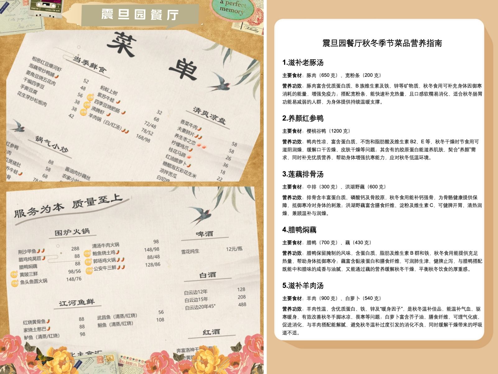立足不同群体的多样化需求,中心的服务升级行动仍在持续深化。现结合秋冬季节特点与营养健康需求,餐饮部制作秋冬菜单营养指南,同时针对商务接待、朋友聚餐、小型会议等不同场景,提供定制化菜单建议,让科学饮食理念与贴心服务延伸至每一个环节。