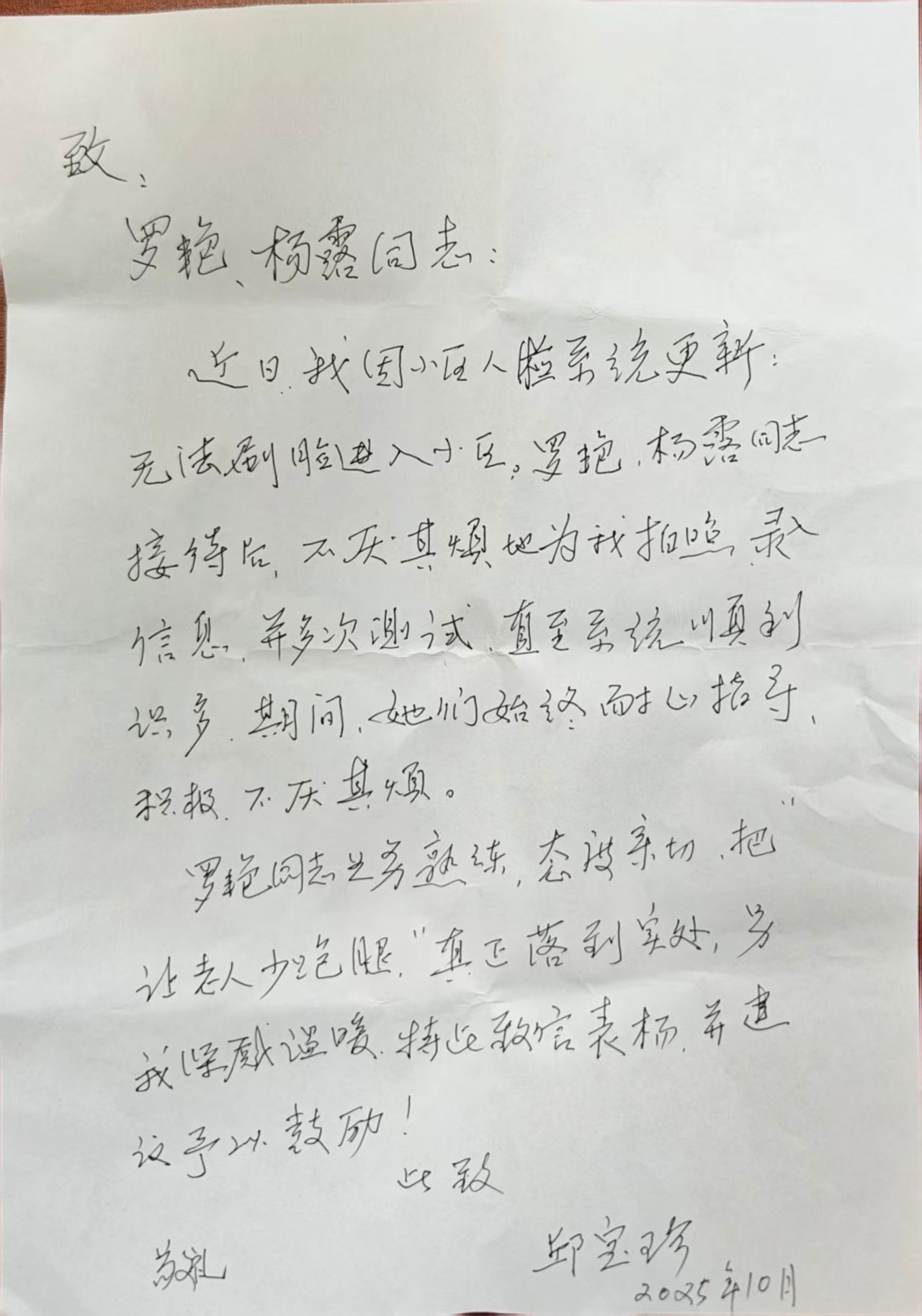 社区的贴心服务,赢得了辖区老同志的认可。地大社区的邱宝珍老人特意登门,送来一封手写感谢信。信中,她动情称赞社区工作人员“业务熟练、态度亲切,真正把 ‘让老人少跑腿’ 的承诺落到了实处,让我深感温暖”。这封朴实的感谢信,既是对社区工作的肯定,也成为了社区持续优化养老服务、提升服务质量的动力。