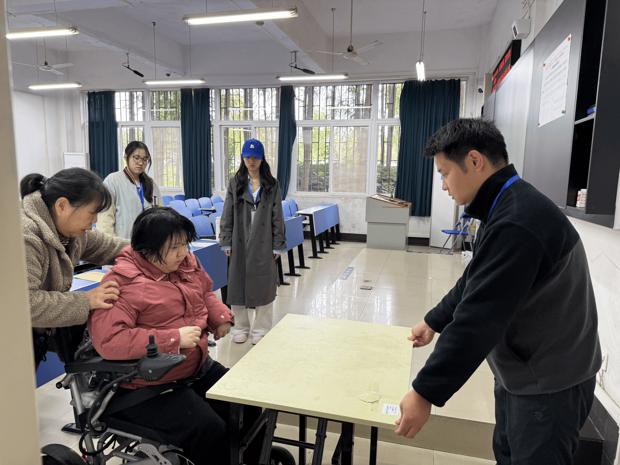 此次考试有两位行动不便的考生,为保障该考生顺利参考,物业服务中心提前与主考单位联系,考点提前制定专项服务方案。根据实际考试需求,准备高度适配的专用桌椅,调整考场内通道宽度,开辟专用的通道,并安排工作人员全程提供引导,帮助考生顺利进出考场完成考试。