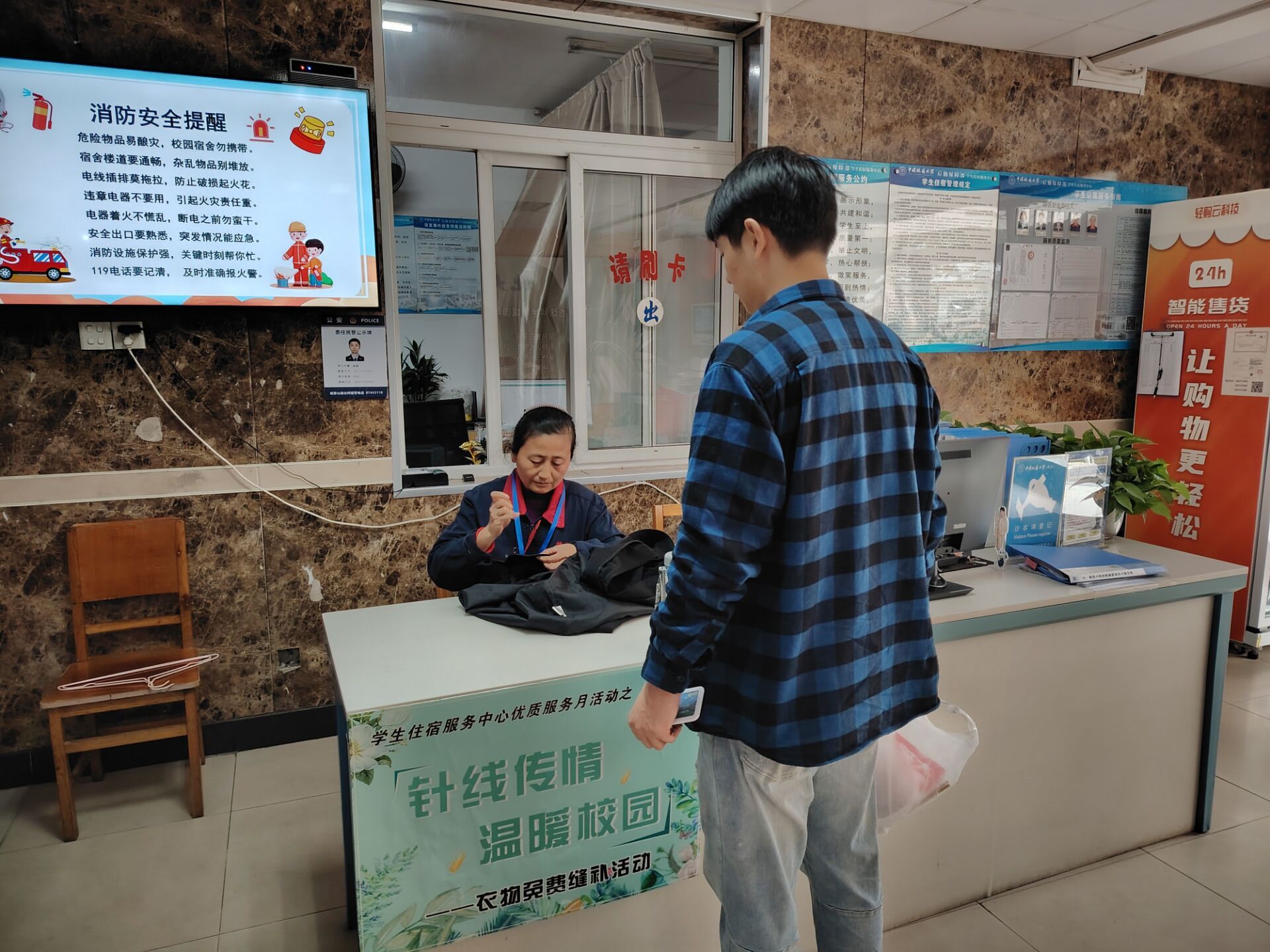 活动期间,中心精准对接学生“急难愁盼”,推出系列免费便民服务。将各宿舍楼值班室打造为24小时“暖心服务站”。值班员化身“缝纫能手”,飞针走线修补衣物;定点投放的免费打气筒,随时满足充气需求;便民服务箱内备有创可贴、碘伏等,工具箱内有小五金工具等一应俱全,这些从小处发力的举措,精准回应学生实际需求,收获广泛好评。