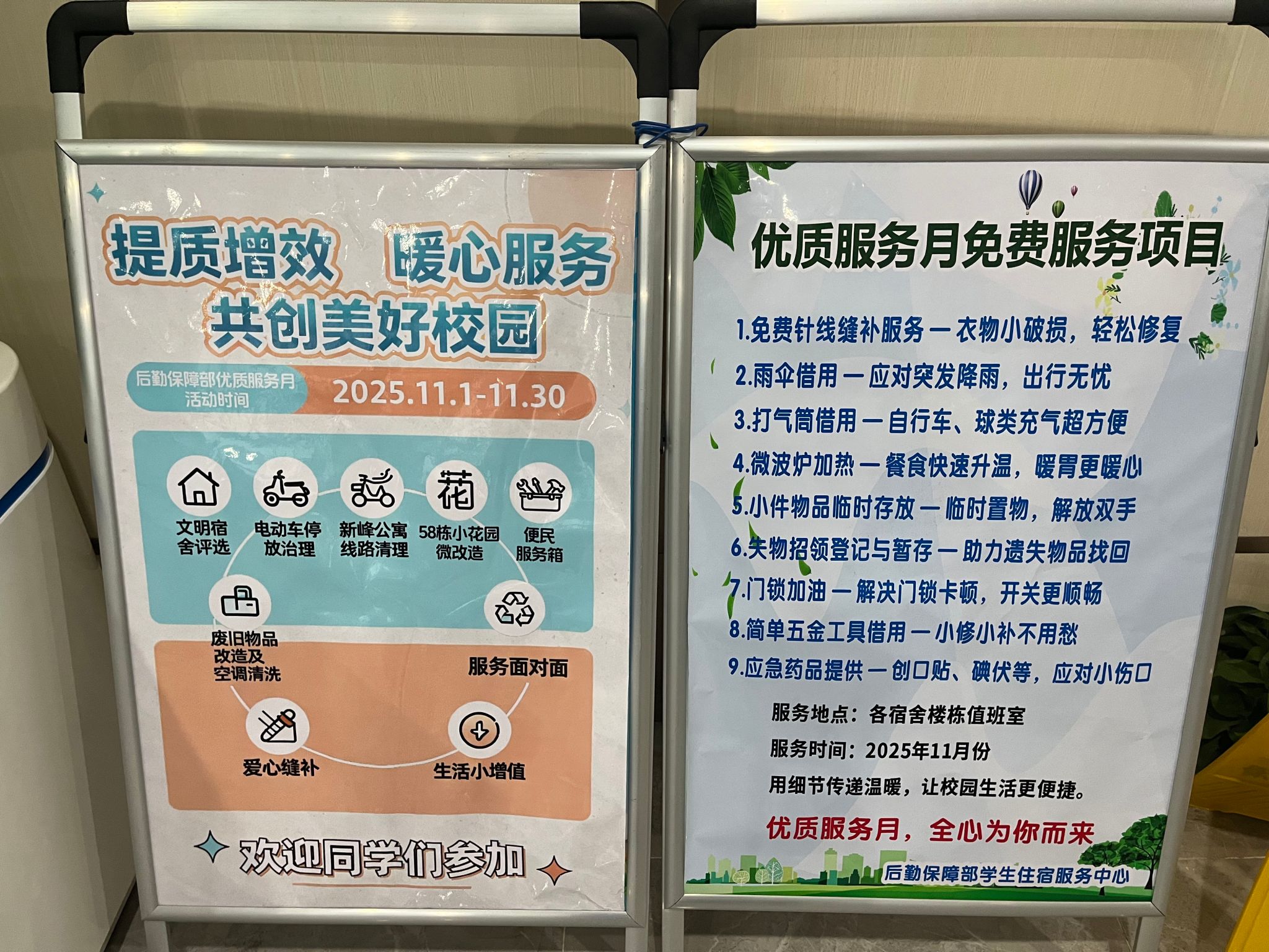 为响应后勤保障部“优质服务月”号召,学生住宿服务中心紧扣 “提质增效,暖心服务,共创美好校园”主题,聚焦学生住宿民生需求,以务实举措将优质服务渗透到学生住宿各环节,让暖意遍布宿舍楼宇。