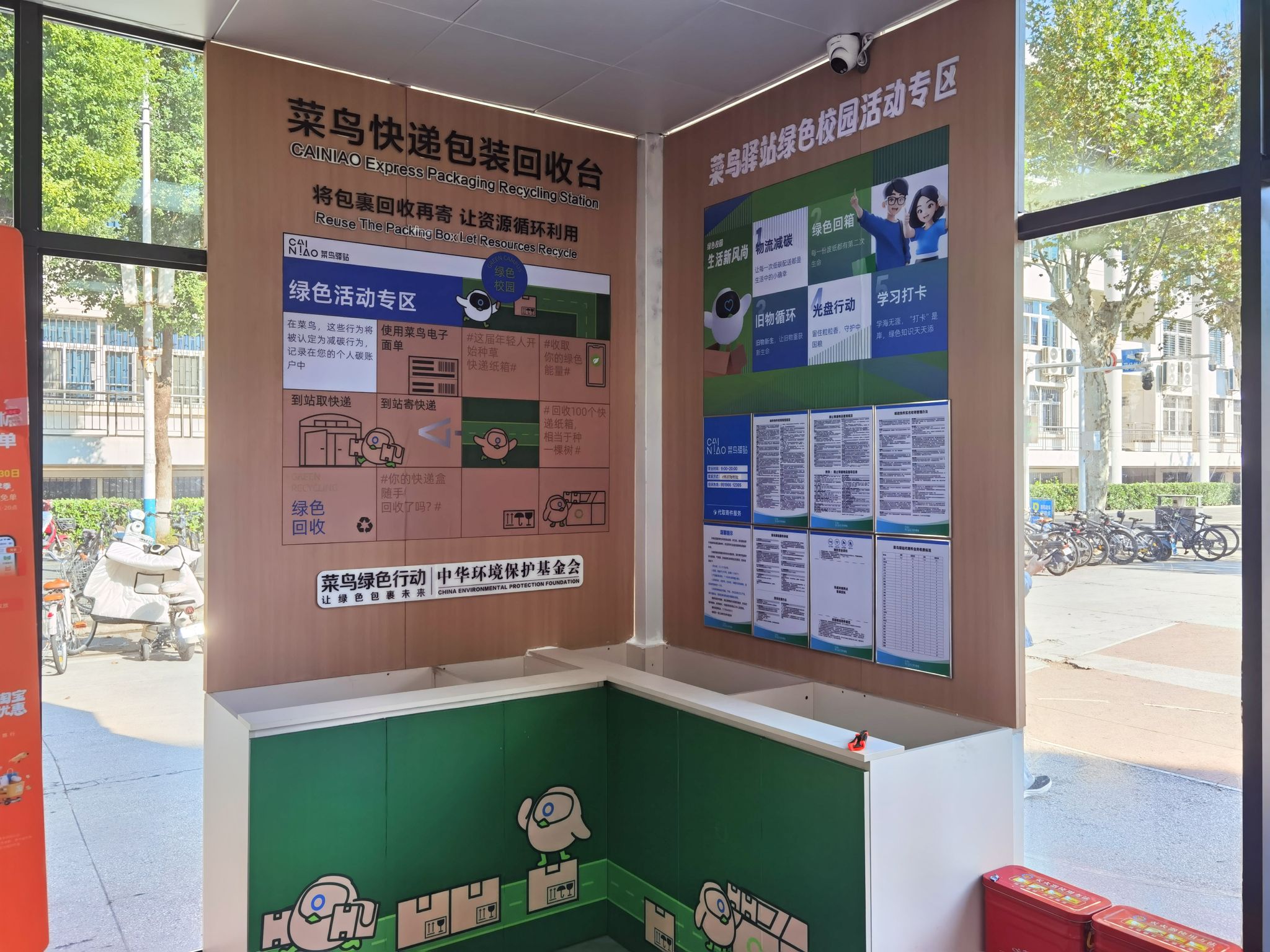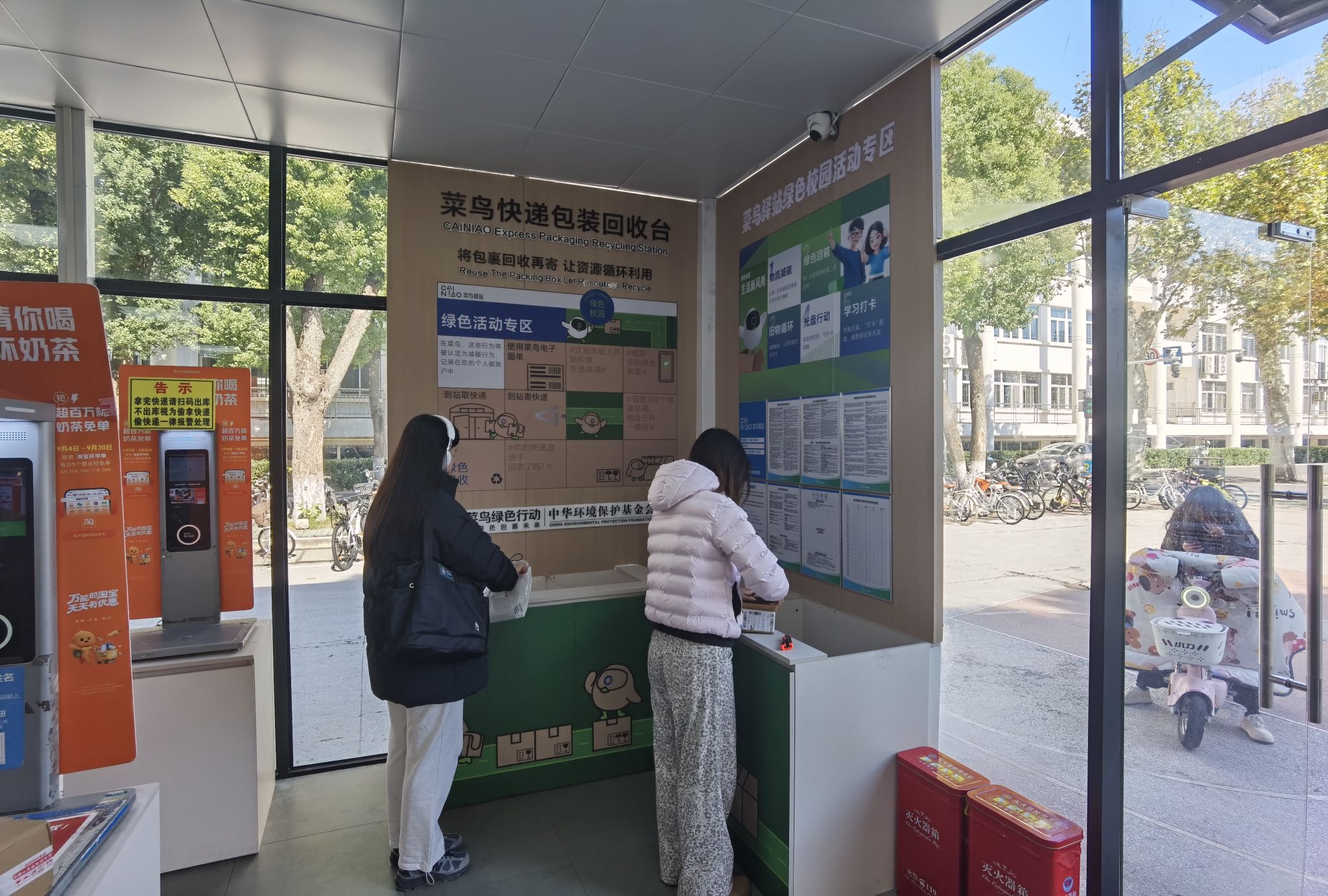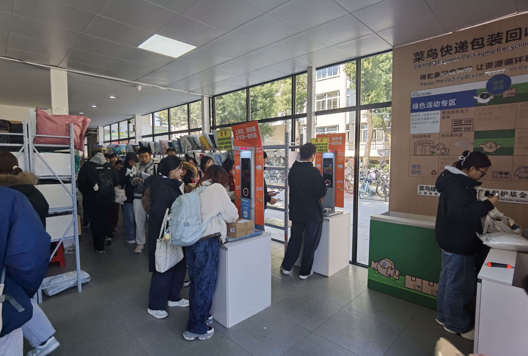 此次升级,以“将包装回收再寄,让资源循环利用”为理念,在驿站快递出库机旁设置“绿色校园活动专区”,引导师生参与快递包装回收循环利用。专区内不仅张贴环保标语、配备回收操作指引,还为师生提供舒适拆件空间与便捷回收渠道,这些举措将快递服务与环保教育深度融合,让“低碳取件、绿色寄件”理念在校园落地生根,为发展绿色校园提供基础。