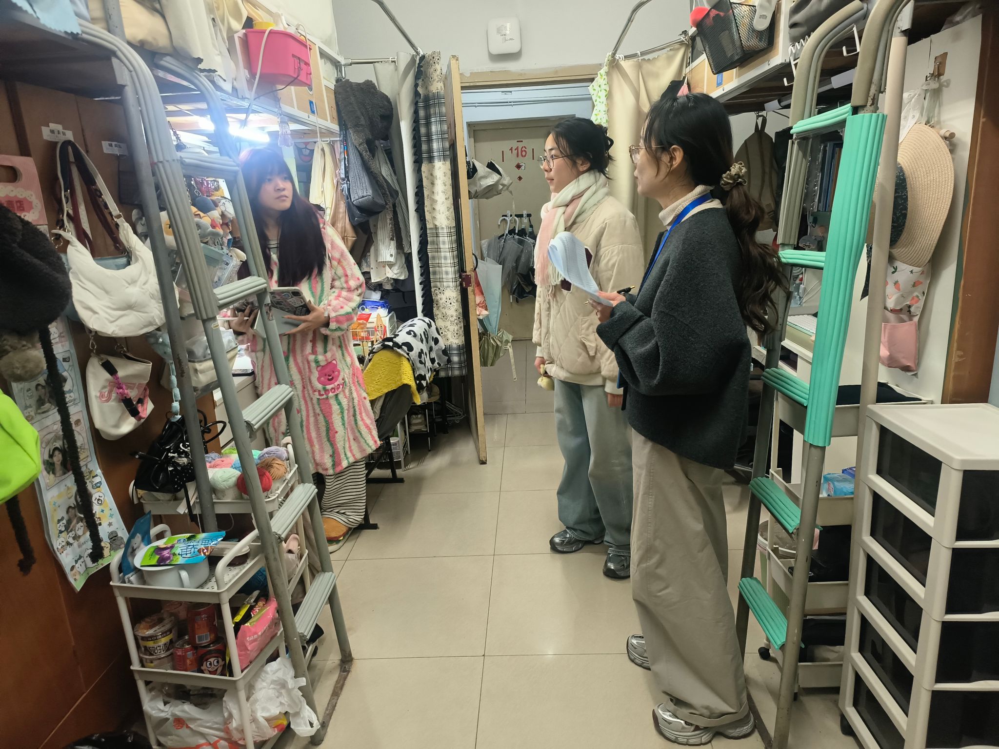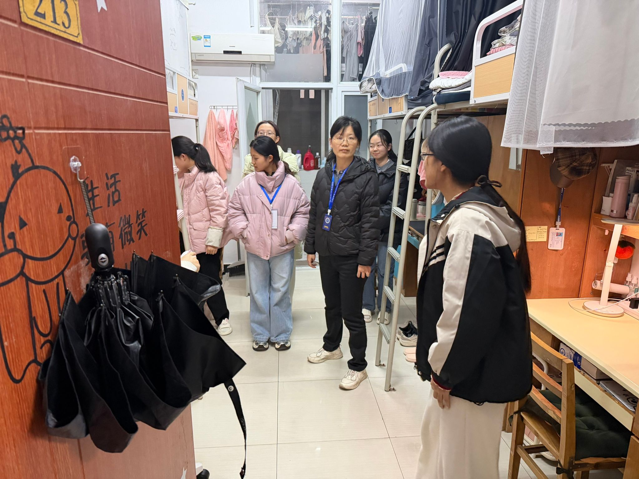 评比活动由学生住宿服务中心副主任杨钦祎带队,中心工作人员与学生代表共40人组成评审小组,分为8组对学校东、西、北三区的320间宿舍开展检查。评审围绕环境卫生、内务整理、安全规范、氛围营造四个维度进行量化打分,重点排查大功率电器使用等安全隐患,并现场再次强调宿舍用电安全相关问题。