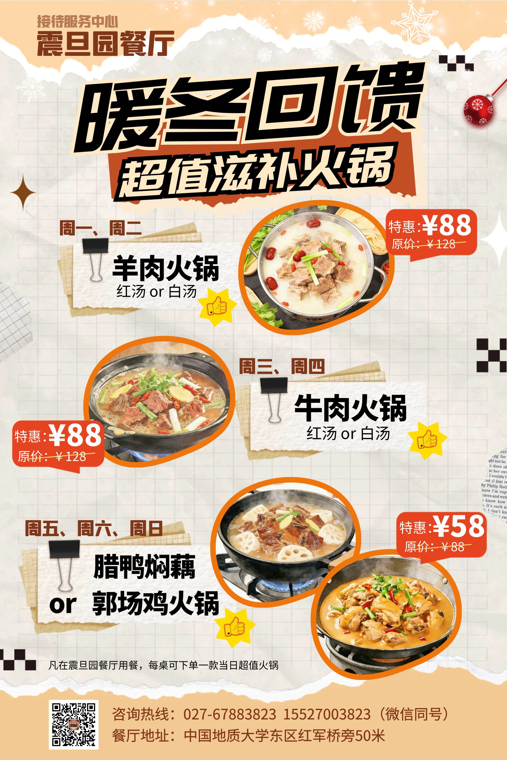 即日起,震旦园餐厅准备了多款“惠选”火锅,将热腾腾的关怀融入日常饮食,以惊喜价格回馈广大师生:每周一、二的羊肉火锅,搭配白萝卜与枸杞,温中补虚、驱寒暖心;每周三、四的牛肉火锅,配有千张,富含优质蛋白,增活力、御严寒;每周五至周日,推出双选火锅——腊鸭焖藕锅与郭场鸡火锅,腊鸭锅每份配以粉藕,润燥健脾;郭场鸡锅加入有机土豆,温润滋养,让温暖从舌尖流淌至心间。餐厅内环境温馨整洁,服务周到细致,无论是单人简餐、双人小聚还是多人聚餐,都能获得舒适的用餐体验。